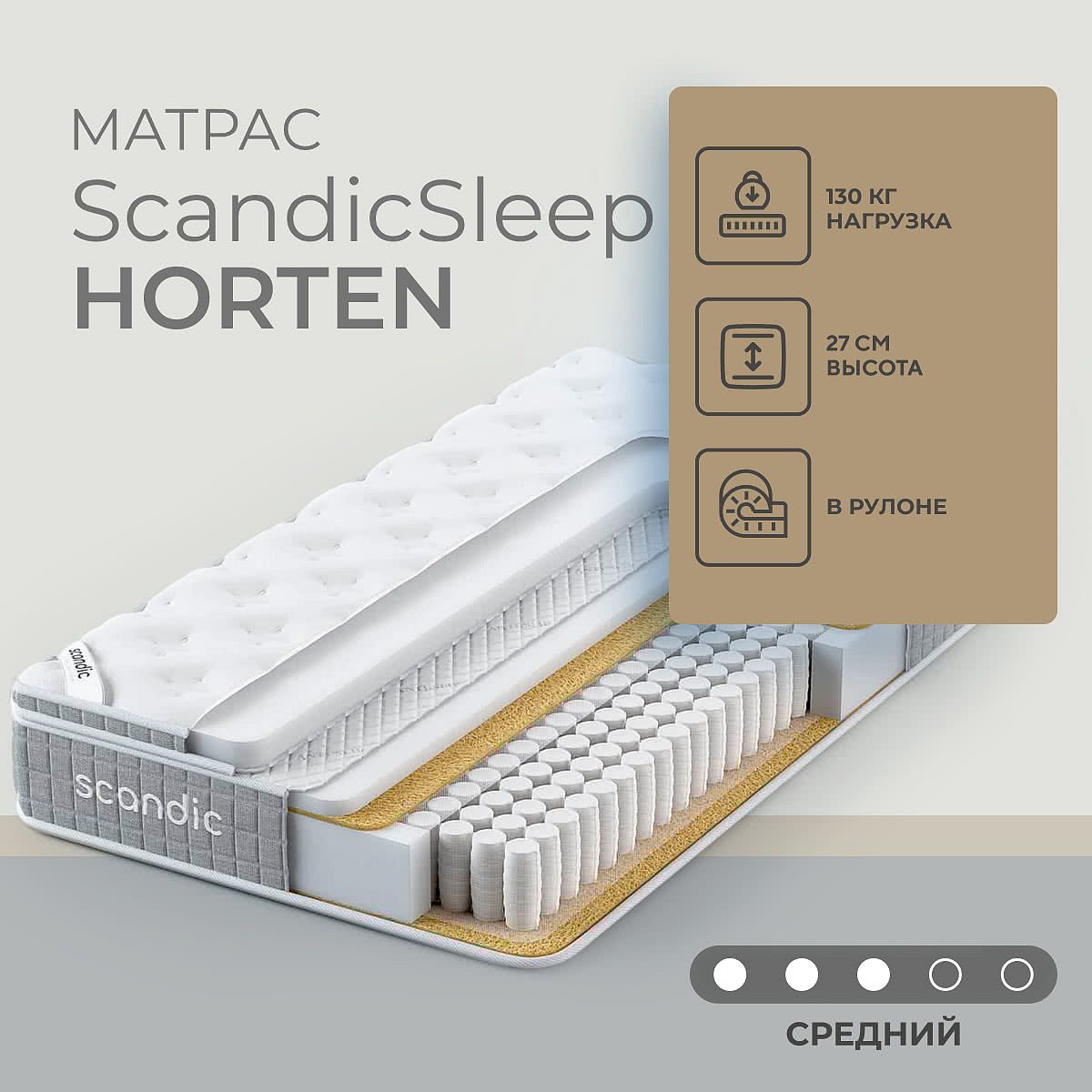 Матрас «ScandicSleep Horten» — средней жесткости, которая подходит большинству людей среднего телосложения. Это — универсальный вариант и детям, и взрослым, и пожилым людям.