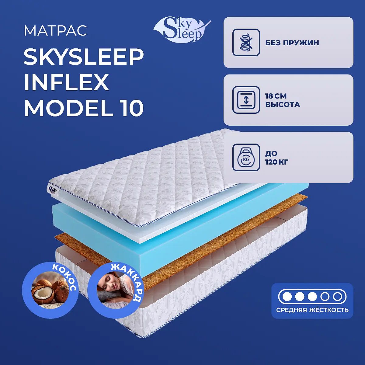 Матрас SkySleep InFlex Model 10 — это беспружинный матрас средней жесткости, который обеспечивает сбалансированную поддержку и комфорт для ежедневного сна. Две разные стороны конструкции позволяют выбрать наиболее подходящее ощущение в зависимости от ваших предпочтений. Высота матраса составляет 18 см, что делает его подходящим для большинства современных кроватей. В основе матраса — сочетание современных материалов: слой холлофайбера (3 см) обеспечивает мягкость и дополнительную упругость, а 14 см высокоэластичного ППУ (пенополиуретана) отвечает за равномерную поддержку тела. С другой стороны добавлен 1 см кокосовой койры, которая придает матрасу дополнительную жесткость и способствует сохранению формы. Чехол выполнен из хлопкового жаккарда с простёжкой на синтепоне (100 г/м2), что обеспечивает приятные тактильные ощущения и аккуратный внешний вид. Матрас выдерживает нагрузку до 120 кг на одно спальное место. Ключевые особенности