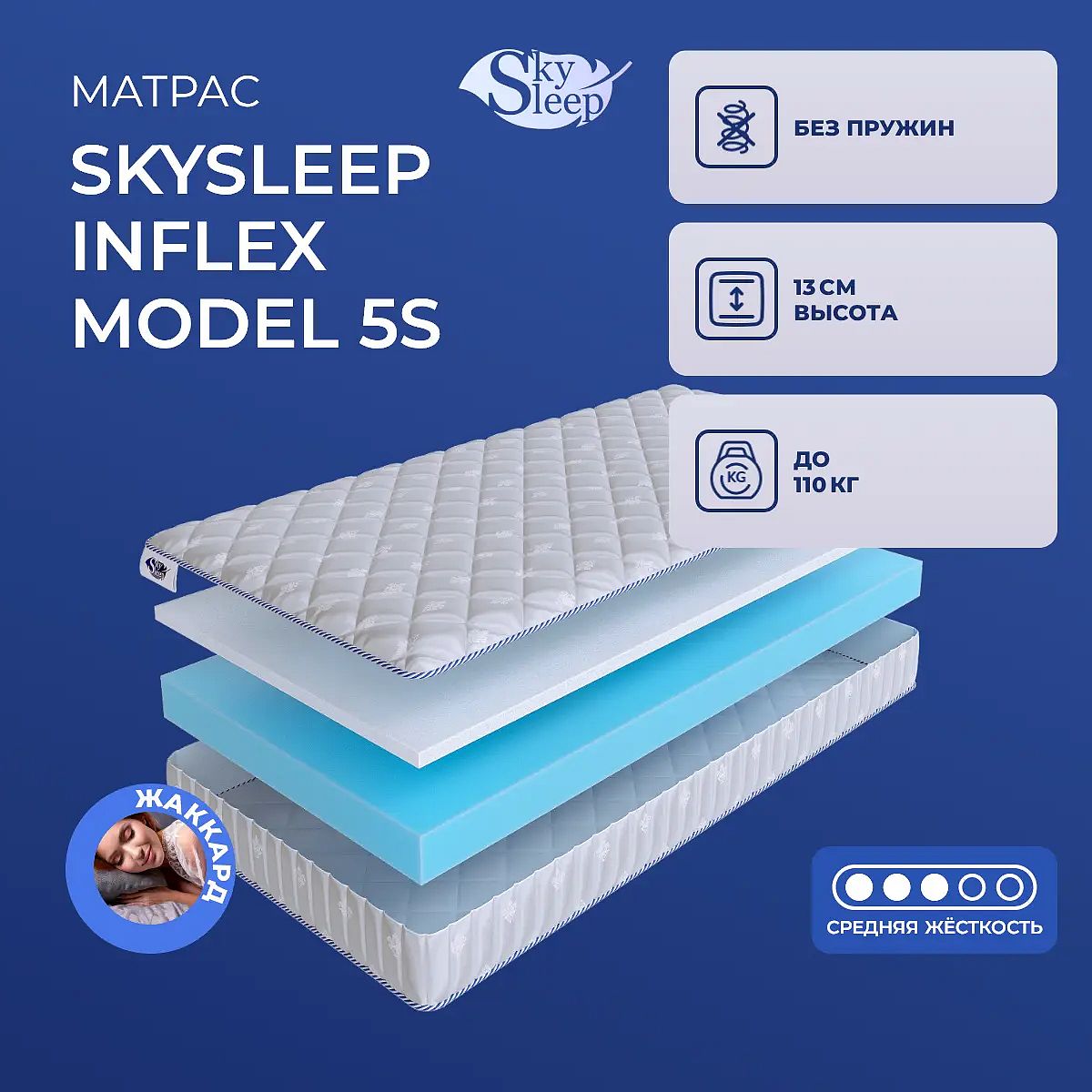 Матрас Skysleep InFlex Model 5s — это беспружинный матрас средней жесткости, созданный для комфортного и поддерживающего сна. Его универсальная конструкция с разными по составу сторонами обеспечивает удобство выбора и подходит для большинства людей со средним телосложением. Высота 13 см позволяет использовать матрас на различных основаниях, а допустимая нагрузка до 110 кг на спальное место делает его практичным решением для ежедневного использования. Ключевые особенности