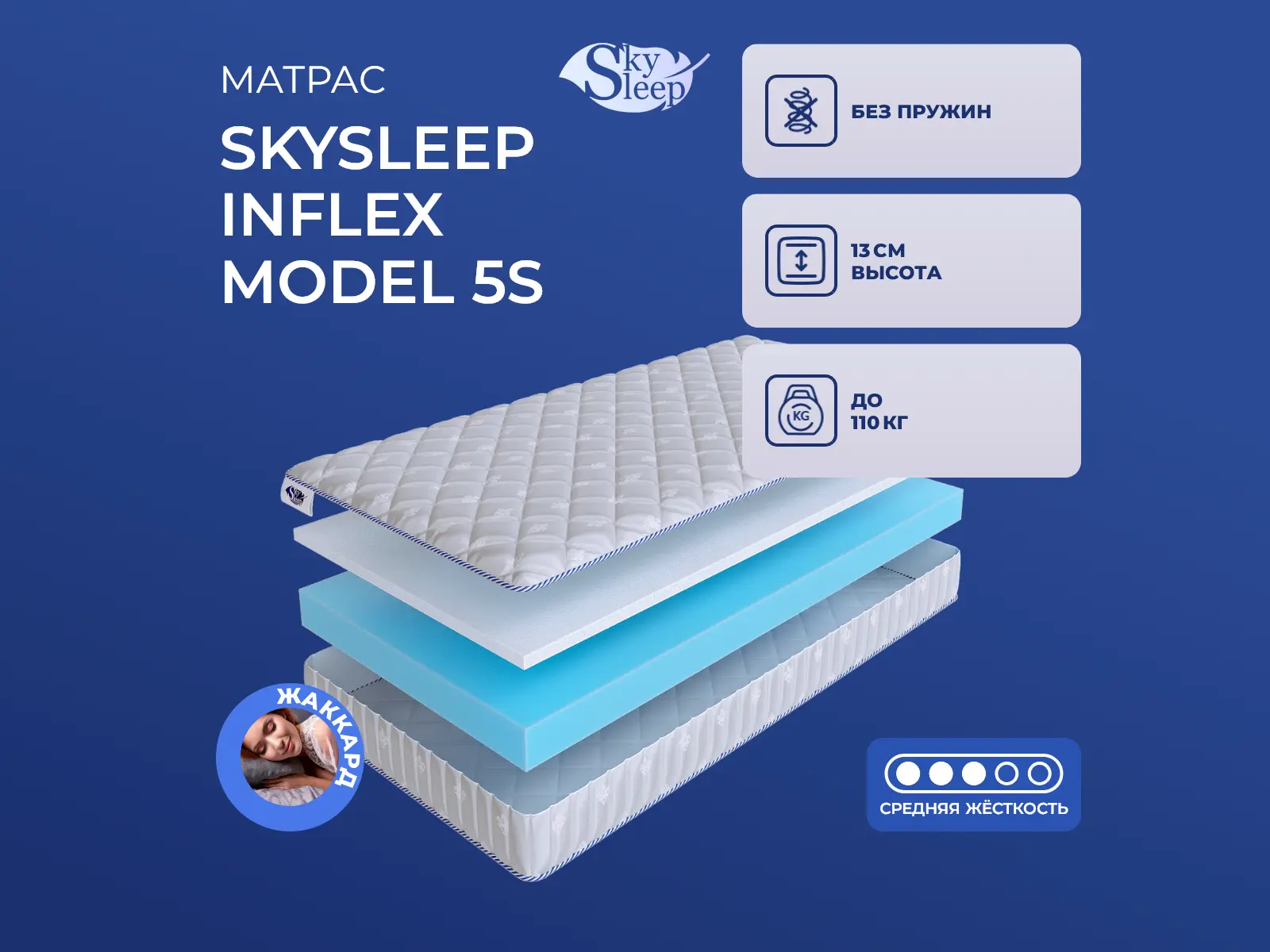Матрас «SkySleep InFlex Model 5s» — средней жесткости, которая подходит большинству людей среднего телосложения. Это — оптимальный вариант и детям, и взрослым, и пожилым людям.