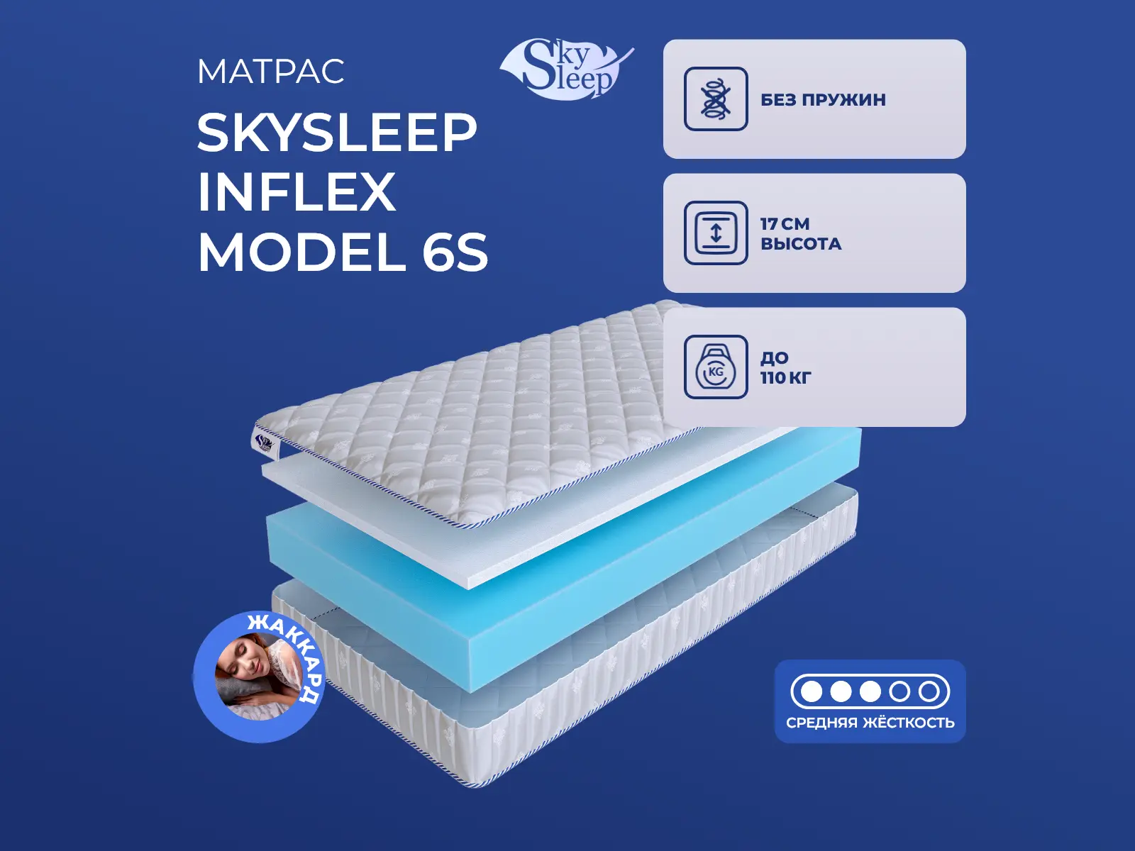 Матрас «SkySleep InFlex Model 6s» — средней жесткости, которая комфортна большинству людей среднего телосложения. Это — универсальный выбор и детям, и взрослым, и пожилым людям.