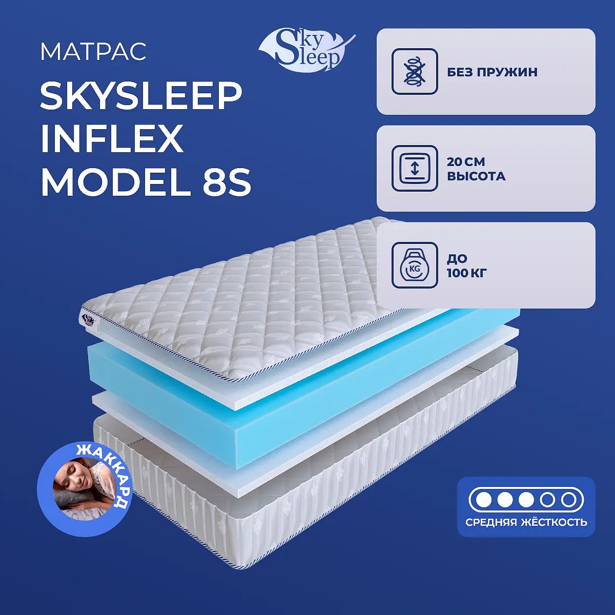 Матрас Skysleep InFlex Model 8s — это беспружинная модель средней жесткости, созданная для стабильной поддержки и комфорта в повседневном использовании. Высота матраса — 20 см, что обеспечивает достаточную толщину для удобного сна на любой кровати. Слои холлофайбера и высокоэластичной пены ППУ равномерно распределяют нагрузку, поддерживают позвоночник и сохраняют форму даже при регулярной эксплуатации. Состав матраса продуман для тех, кто ценит простоту ухода и долговечность. Чехол выполнен из прочного синтетического жаккарда со стежкой на синтепоне (100 г/м2), что придает поверхности аккуратный внешний вид и защищает внутренние слои от износа. Матрас подходит для людей с весом до 100 кг на одно спальное место. Ключевые особенности