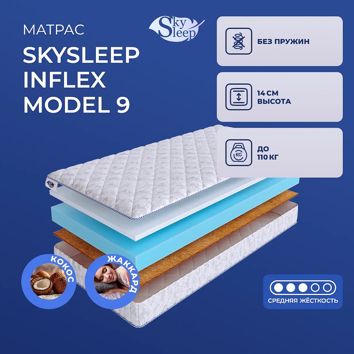 Матрас SkySleep InFlex Model 9 — качественный беспружинный матрас средней жесткости, созданный для ежедневного комфортного сна. Благодаря сочетанию современных материалов, матрас обеспечивает оптимальную поддержку и приятные ощущения для сна и отдыха. Обе стороны имеют разную структуру, что позволяет подобрать наиболее удобную поверхность. В основе матраса — слой холлофайбера (3 см), который отличается упругостью и хорошо держит форму, а также 14 см пенополиуретана для надежной поддержки тела. С одной из сторон добавлен 1 см кокосовой койры, что придает матрасу дополнительную упругость и обеспечивает комфорт для сна на средней жесткости. Чехол выполнен из жаккардовой ткани с простежкой на синтепоне 100 г/м2, что делает поверхность приятной на ощупь и долговечной. Ключевые особенности
