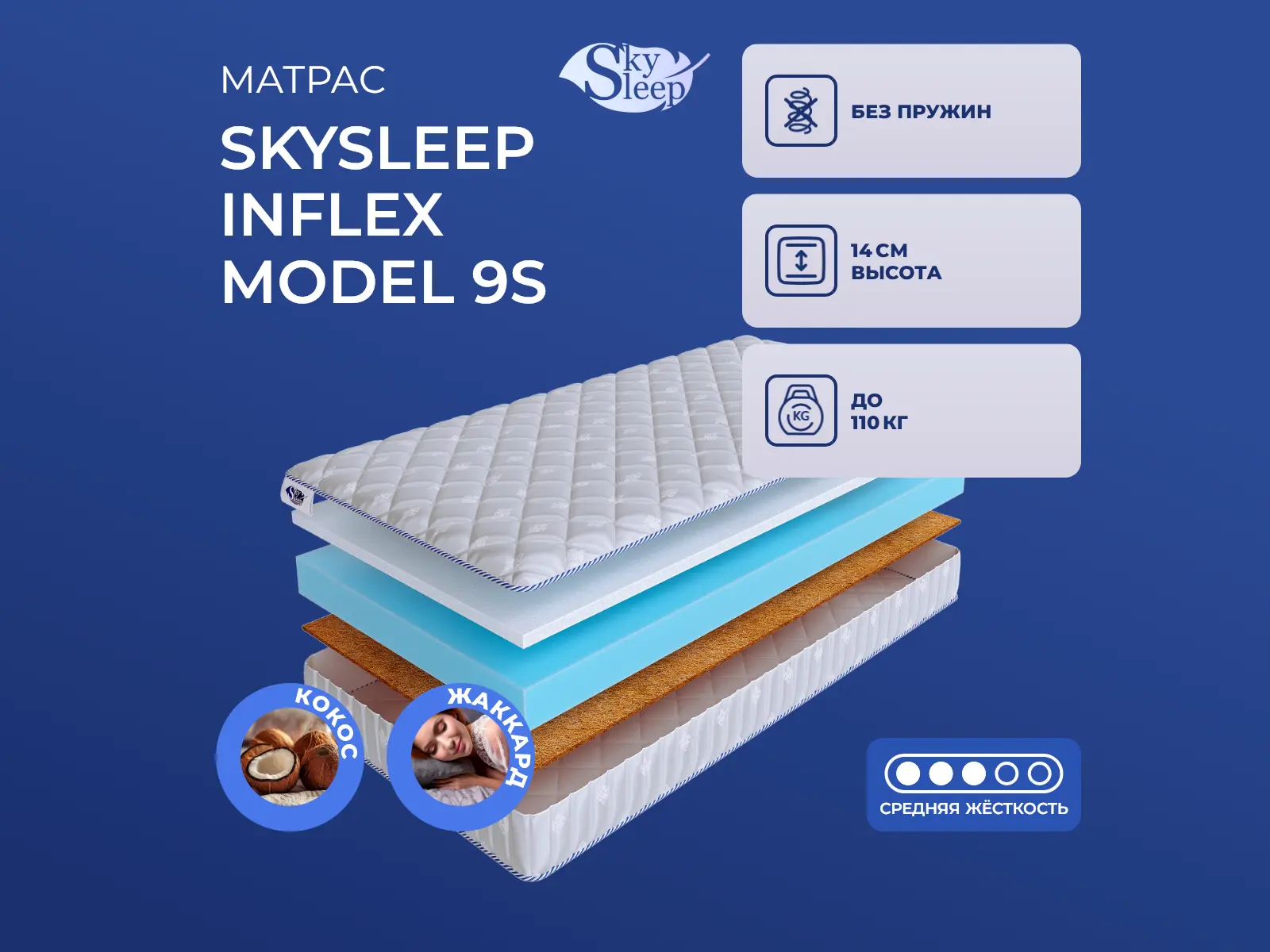 Матрас «SkySleep InFlex Model 9s» — средней жесткости, которая подходит большинству людей среднего телосложения. Это — оптимальный вариант и детям, и взрослым, и пожилым людям.