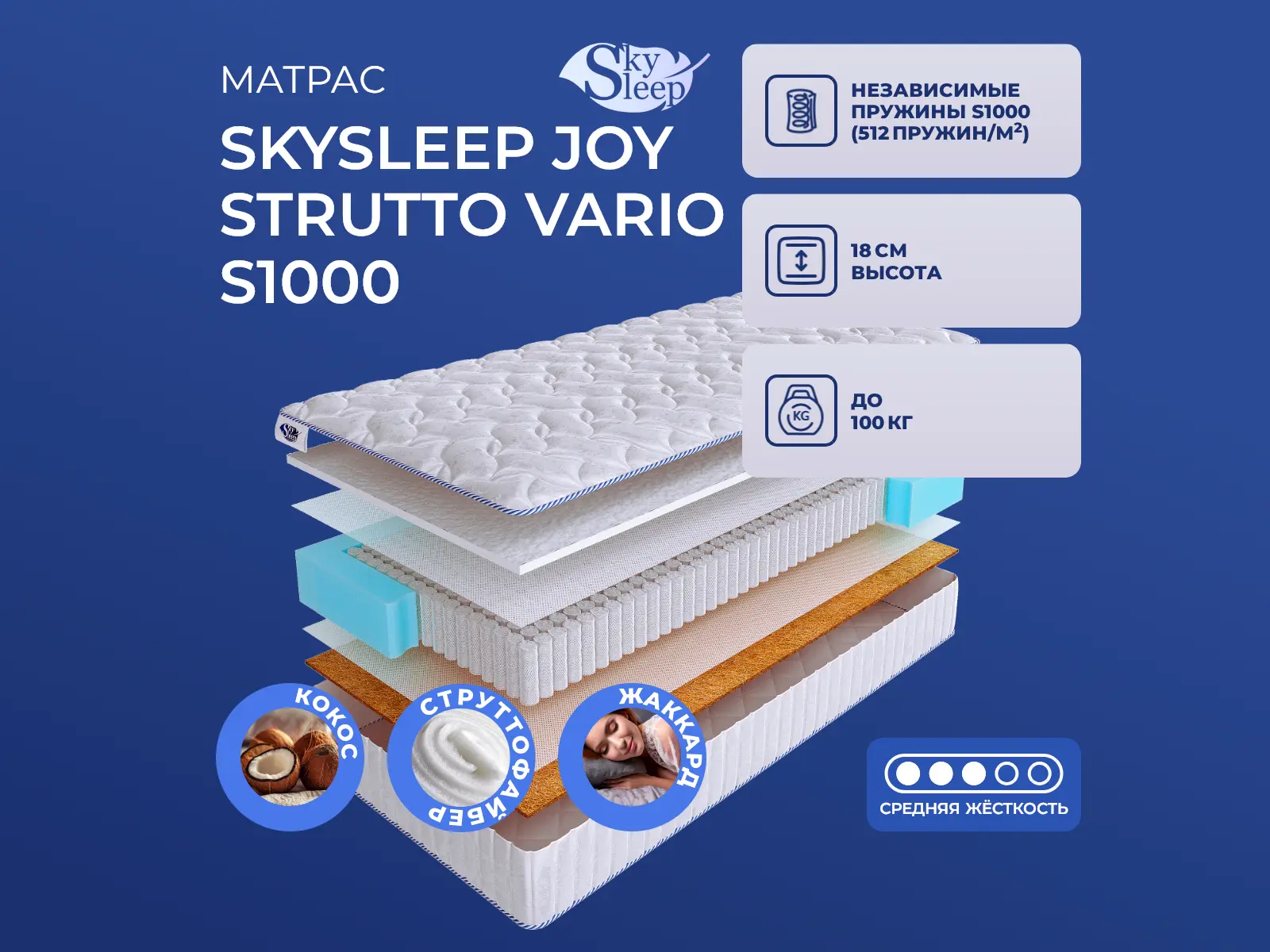 Матрас «SkySleep Joy Strutto Vario S1000» — средней жесткости, которая комфортна большинству людей среднего телосложения. Это — оптимальный выбор и детям, и взрослым, и пожилым людям.