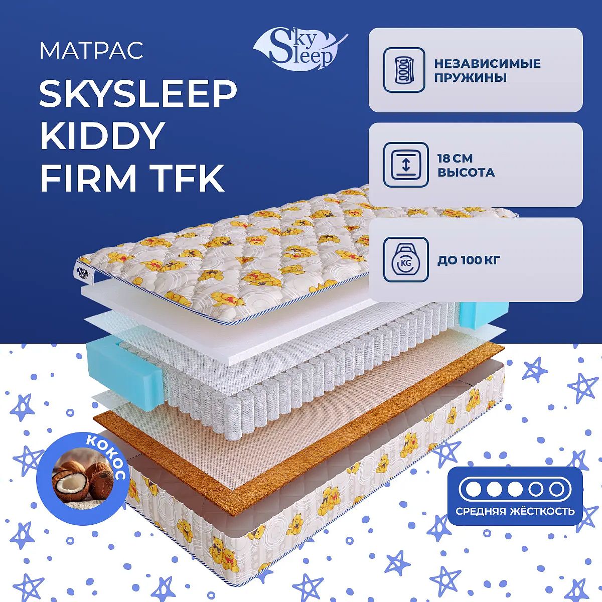 Матрас «SkySleep Kiddy Firm TFK» — средней жесткости, которая комфортна большинству людей среднего телосложения. Это — универсальный вариант и детям, и взрослым, и пожилым людям.
