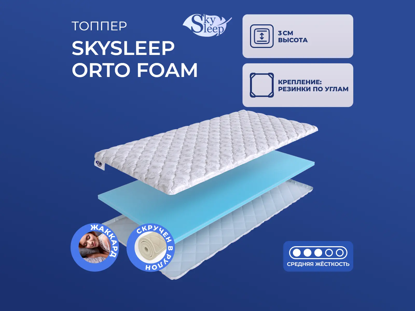 Матрас «SkySleep Orto Foam» — средней жесткости, которая подходит большинству людей среднего телосложения. Это — оптимальный вариант и детям, и взрослым, и пожилым людям.