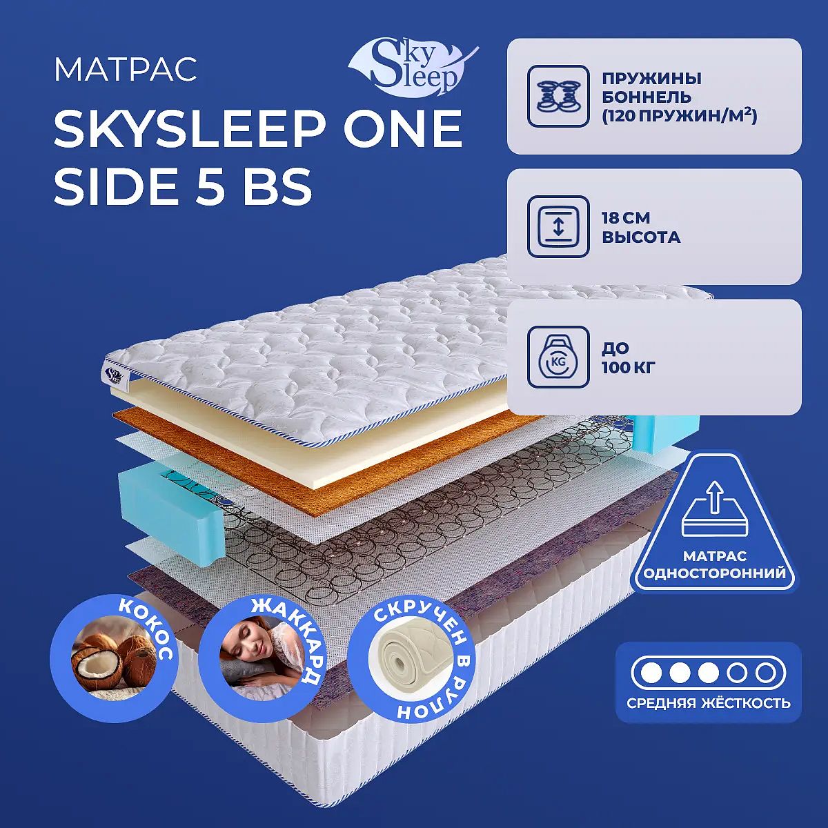 Матрас «SkySleep One Side 5 BS» — средней жесткости, которая комфортна большинству людей среднего телосложения. Это — универсальный вариант и детям, и взрослым, и пожилым людям.