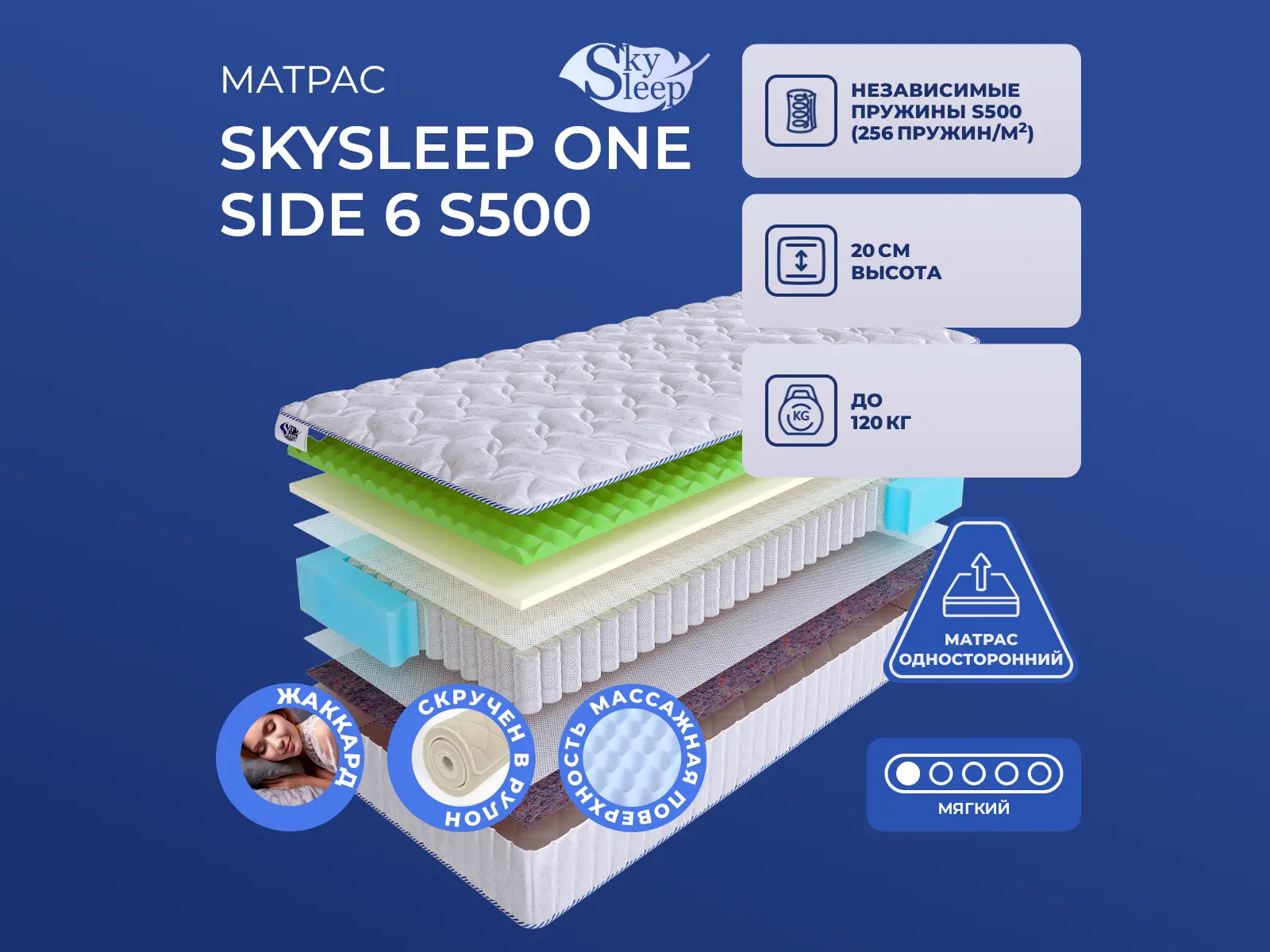 Мягкий матрас «SkySleep One Side 6 S500» отлично подойдет человеку с небольшим весом, ценителю комфорта.