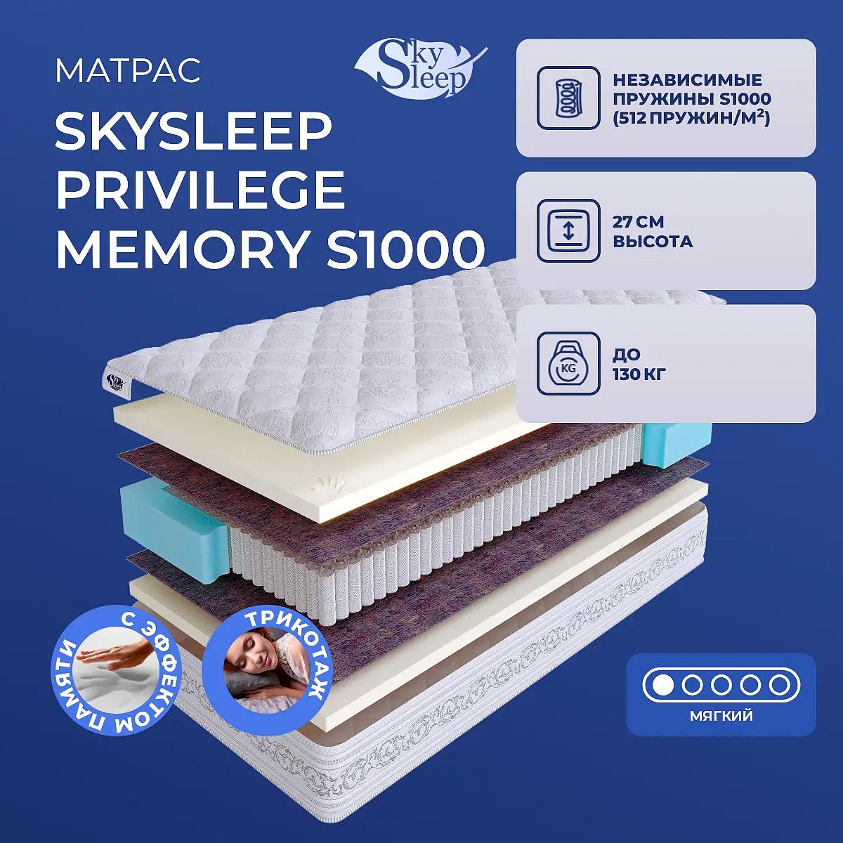 Матрас SkySleep Privilege Memory S1000 создан для тех, кто ценит мягкость, заботу о теле и комфорт каждый день. Высота 27 см и современная конструкция с независимым пружинным блоком S1000 (512 пружин на м2) обеспечивают точную поддержку и приятную упругость без излишней жёсткости. Мемориформ толщиной 4 см с обеих сторон подстраивается под контуры тела, мягко распределяет давление и помогает полностью расслабиться во время сна. Чехол выполнен из объёмного хлопкового трикотажа, простёганного на шерстипоне 450 г/м2. Такая отделка дарит ощущение мягкости и уюта, хорошо пропускает воздух и сохраняет комфортную температуру. Термовойлок внутри конструкции увеличивает прочность и продлевает срок службы матраса. Ключевые особенности