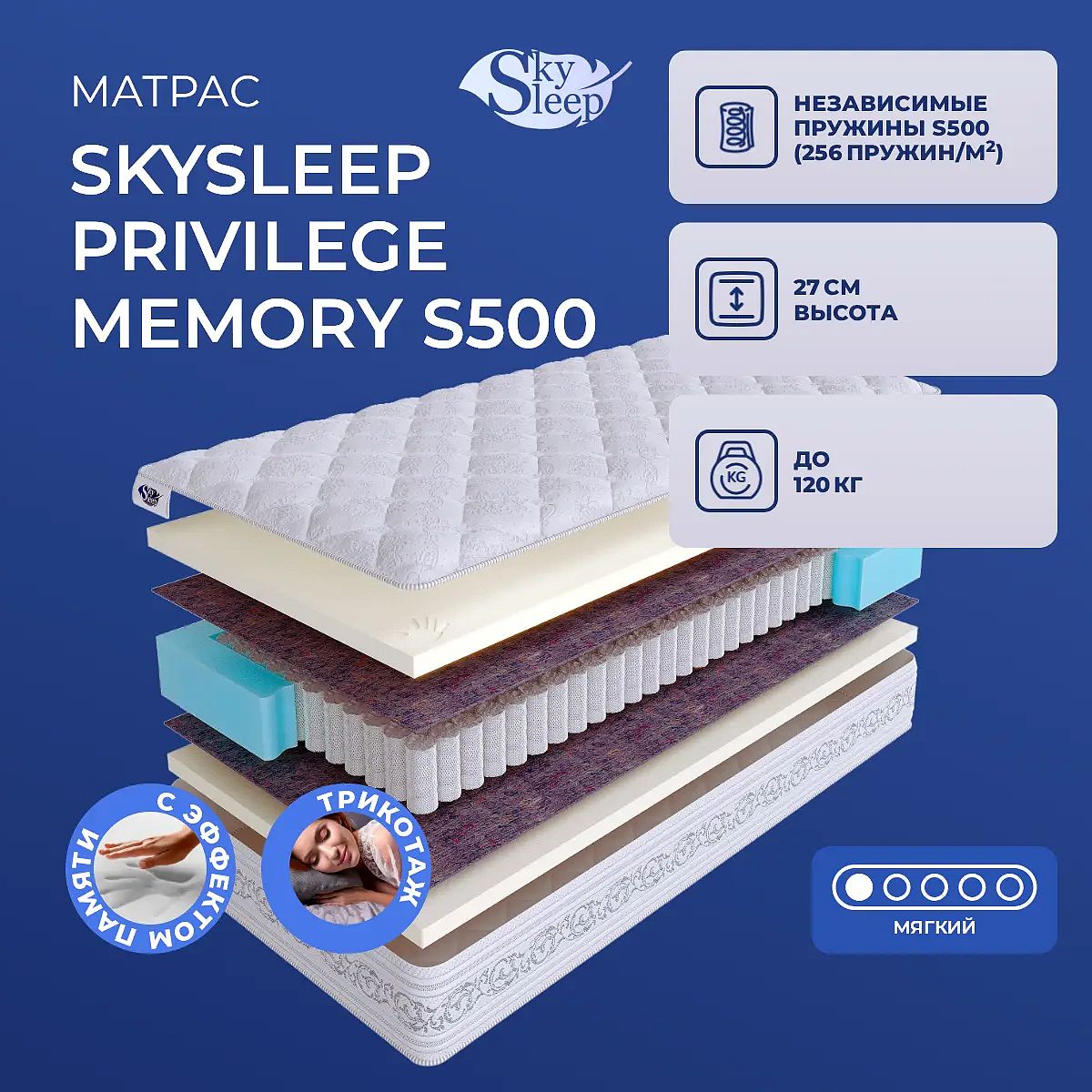 SkySleep Privilege Memory S500 — мягкий пружинный матрас с выраженным комфортом для ценителей расслабляющего сна. Благодаря слою мемориформ толщиной 4 см с обеих сторон матрас бережно подстраивается под контуры тела, обеспечивая ощущение невесомости и глубокого расслабления мышц. Независимый пружинный блок S500 (256 пружин на м2) рассчитан на нагрузку до 120 кг и поддерживает анатомическую позицию тела на протяжении всей ночи. Высота матраса — 27 см, что придаёт спальному месту солидный и современный вид. Чехол выполнен из объёмного хлопкового трикотажа, простёганного на шерстипоне плотностью 450 г/м2, что добавляет мягкости и приятных тактильных ощущений. Термовойлок в составе защищает мягкие слои и равномерно распределяет нагрузку, сохраняя свойства матраса на долгие годы. Ключевые особенности