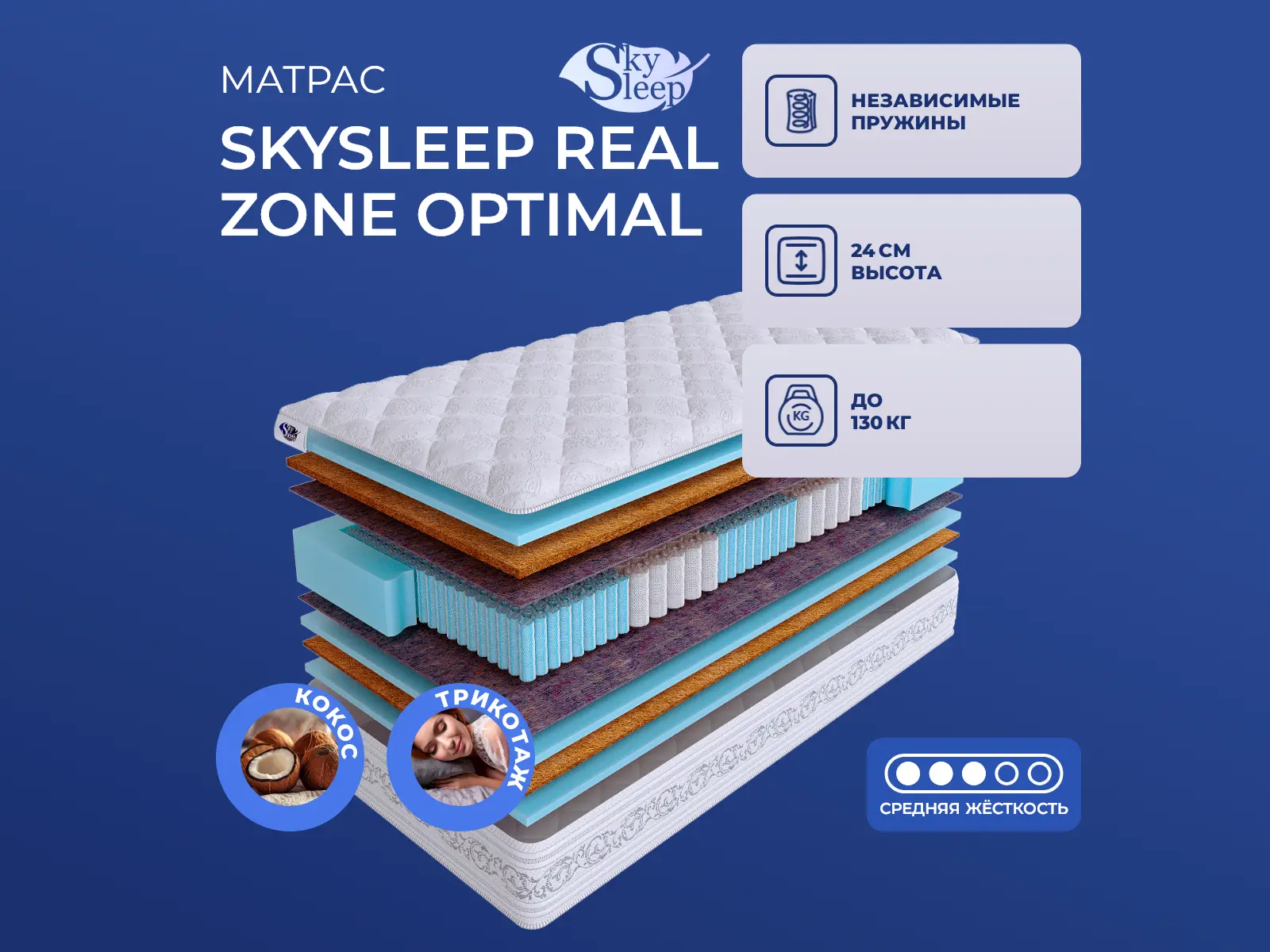Матрас «SkySleep Real Zone Optimal» — средней жесткости, которая подходит большинству людей среднего телосложения. Это — оптимальный выбор и детям, и взрослым, и пожилым людям.