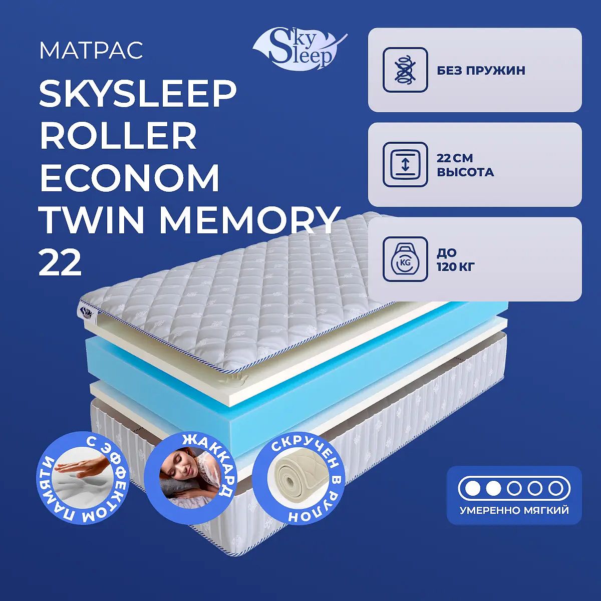 Средне-мягкий матрас «SkySleep Roller Econom Twin Memory 22» просто создан для настоящего ценителя комфорта. Такая модель хорошо подходит людям с небольшим весом.