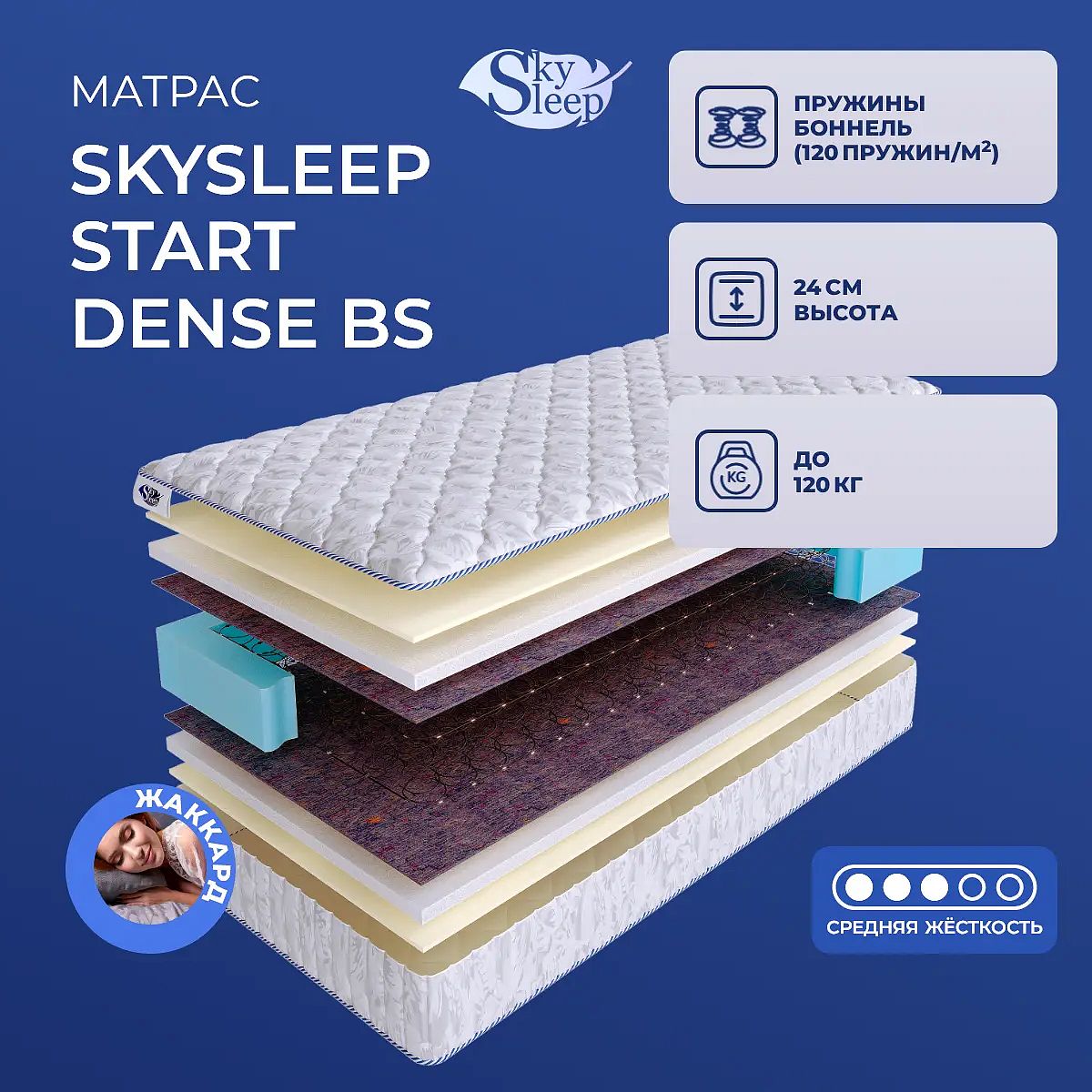 Матрас «SkySleep Start Dense BS» — средней жесткости, которая подходит большинству людей среднего телосложения. Это — универсальный выбор и детям, и взрослым, и пожилым людям.