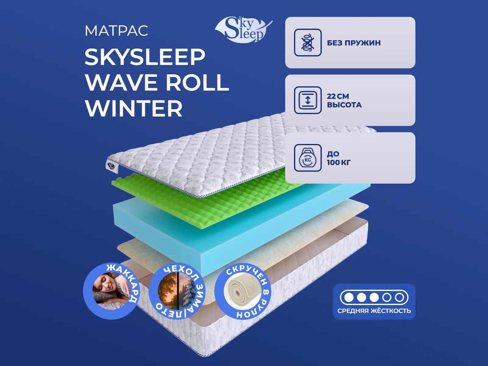 Матрас «SkySleep Wave Roll Winter» — средней жесткости, которая комфортна большинству людей среднего телосложения. Это — универсальный выбор и детям, и взрослым, и пожилым людям.