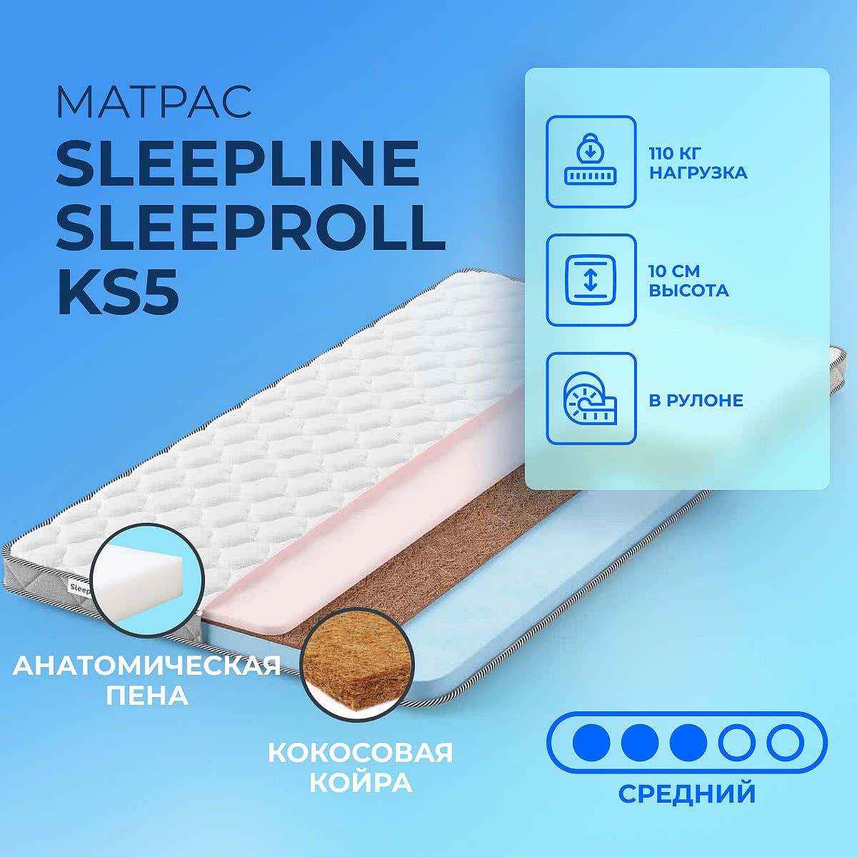 Матрас «Sleepline SleepRoll KS5» — средней жесткости, которая подходит большинству людей среднего телосложения. Это — оптимальный выбор и детям, и взрослым, и пожилым людям.