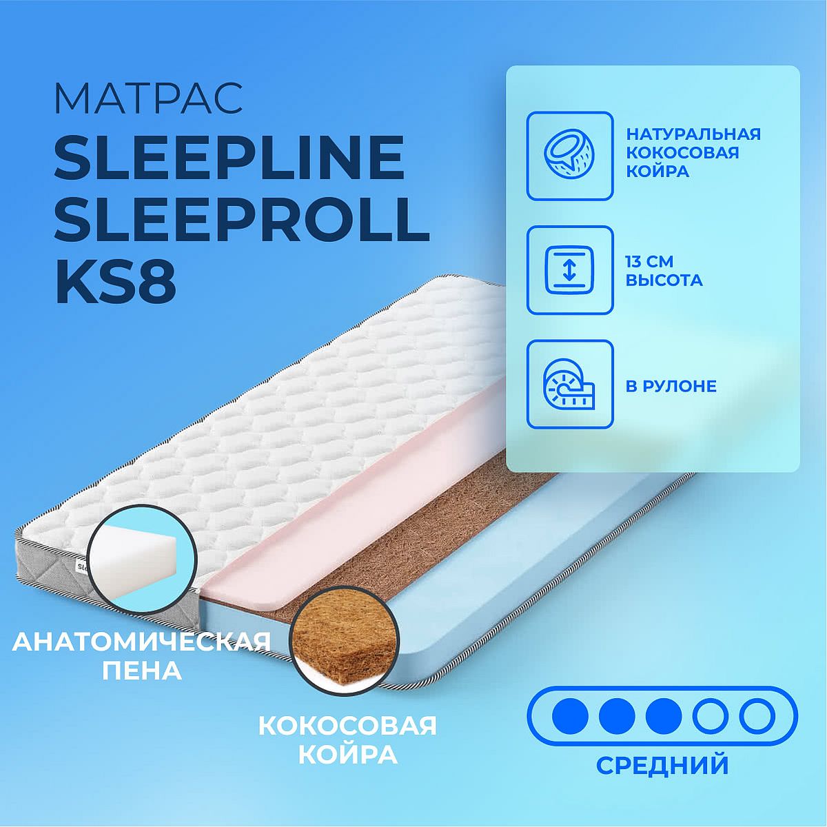 Матрас «Sleepline SleepRoll KS8» — средней жесткости, которая подходит большинству людей среднего телосложения. Это — оптимальный выбор и детям, и взрослым, и пожилым людям.