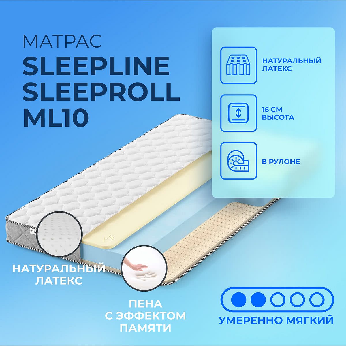 Средне-мягкий матрас «Sleepline SleepRoll ML10» — для настоящего ценителя комфорта. Такая модель хорошо подходит людям с небольшим весом.