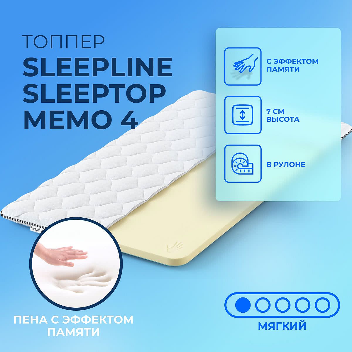 Мягкий матрас «Sleepline SleepTop Memo 4» отлично подойдет человеку с небольшим весом, предпочитающему высокий уровень комфорта.