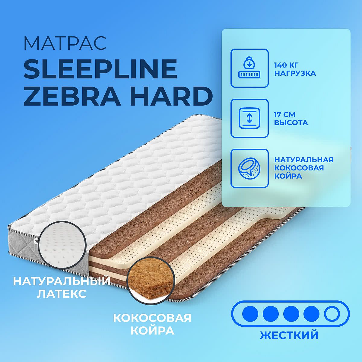 Беспружинный жесткий матрас на основе чередующихся слоев латекса и кокоса.Состав матраса:
