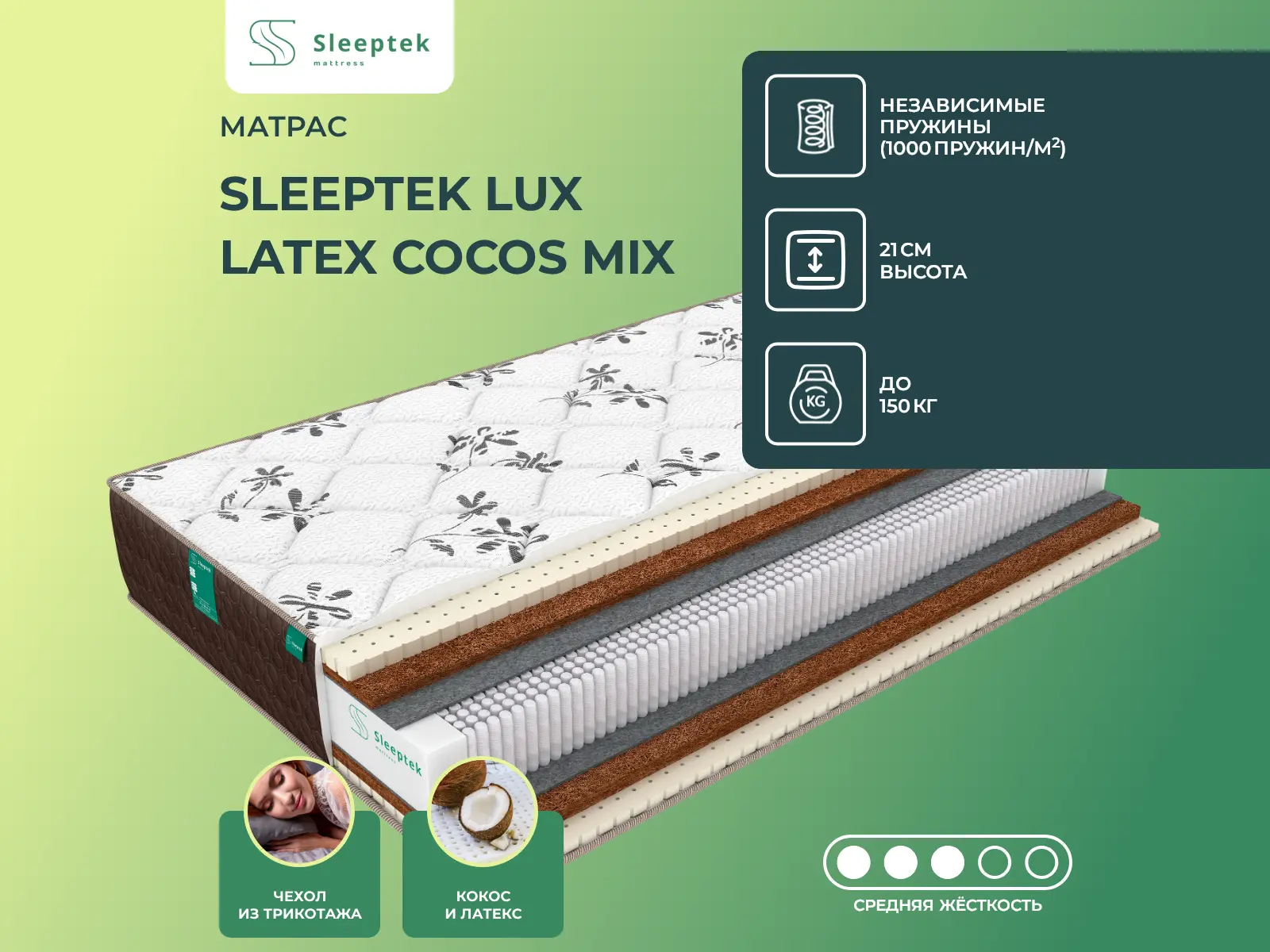 Матрас «Sleeptek Lux Latex Cocos Mix» — средней жесткости, которая подходит большинству людей среднего телосложения. Это — универсальный выбор и детям, и взрослым, и пожилым людям.