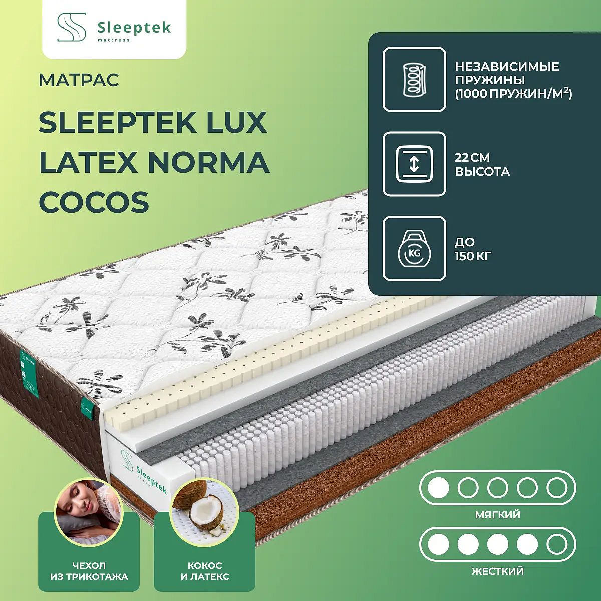 Преимущество матраса Lux Latex Norma Cocos — он имеет 2 различные по жесткости стороны: мягкую и жесткую.