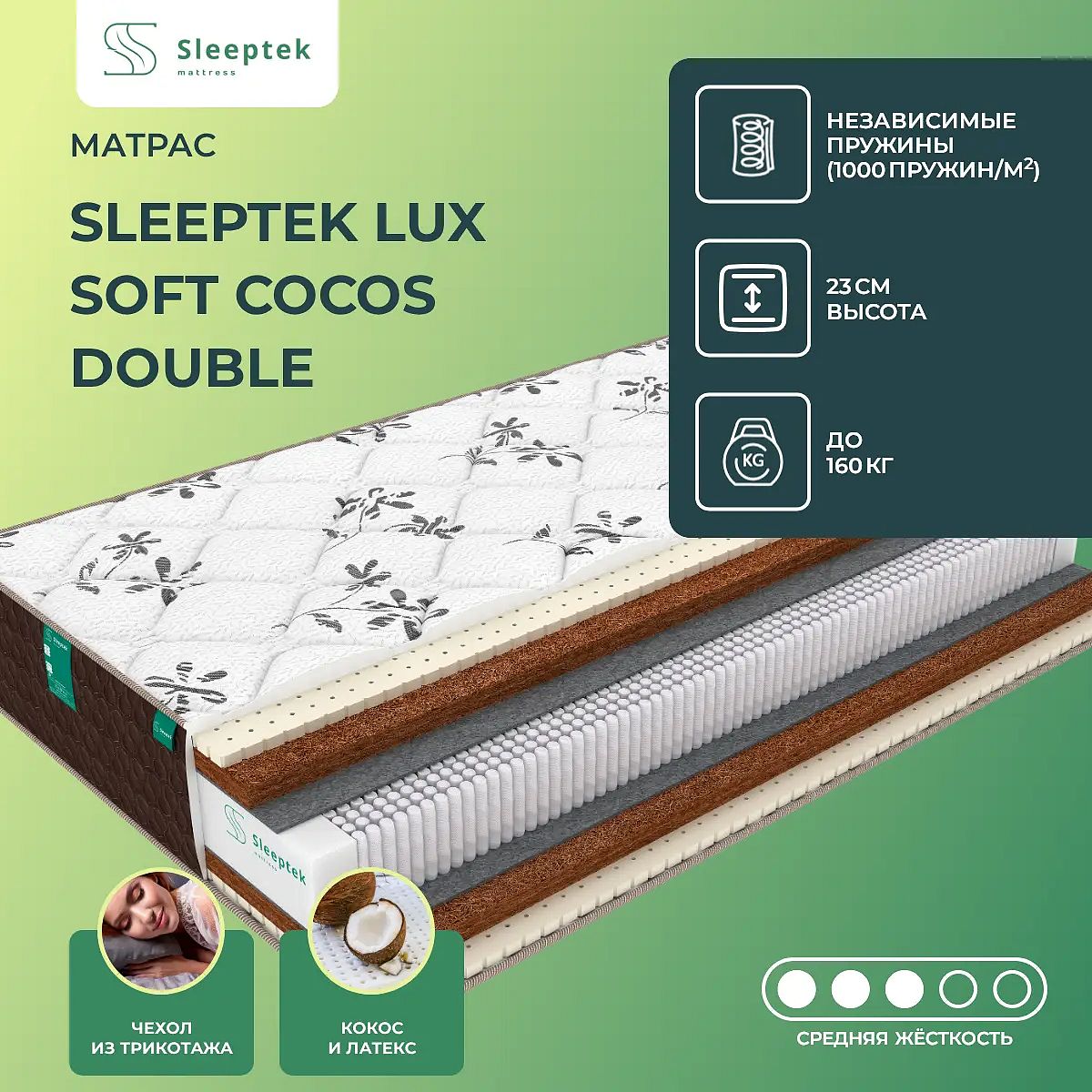 Матрас «Sleeptek Lux Soft Cocos Double» — средней жесткости, которая комфортна большинству людей среднего телосложения. Это — оптимальный вариант и детям, и взрослым, и пожилым людям.