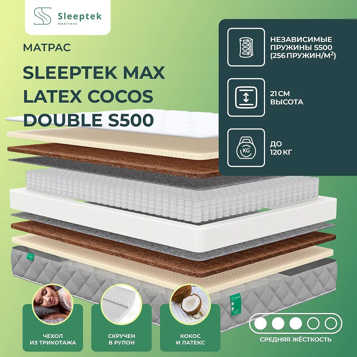 Матрас «Sleeptek Max Latex Cocos Double S500» — средней жесткости, которая подходит большинству людей среднего телосложения. Это — универсальный выбор и детям, и взрослым, и пожилым людям.