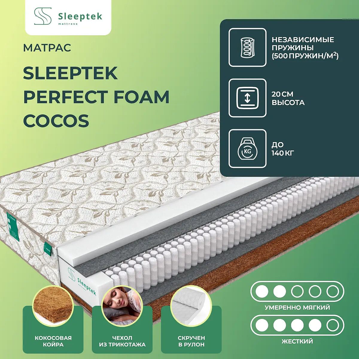 Преимущество матраса Perfect Foam Cocos — он имеет 2 различные по жесткости стороны: средне-мягкую и жесткую.