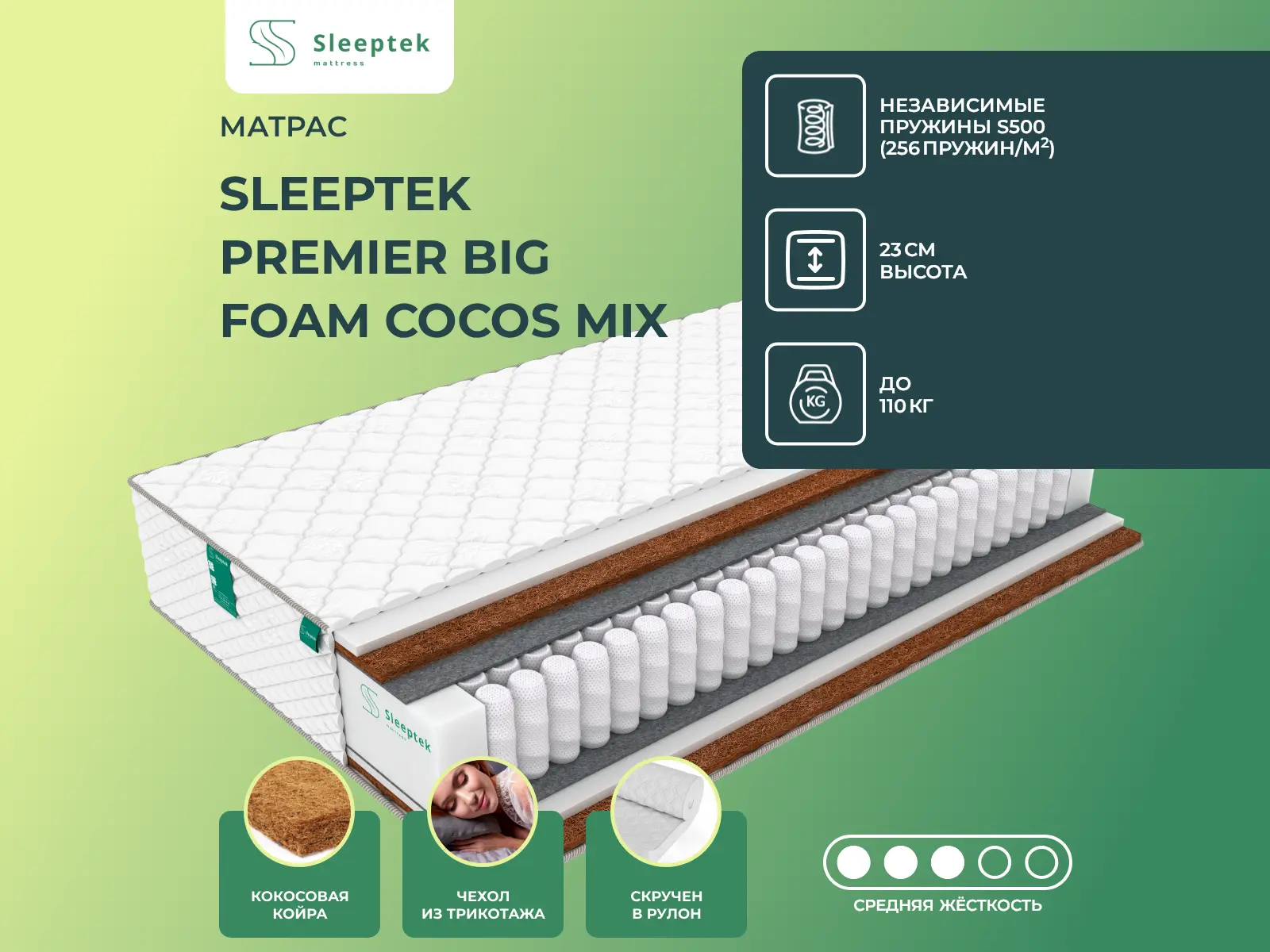 Матрас «Sleeptek Premier Big Foam Cocos Mix» — средней жесткости, которая подходит большинству людей среднего телосложения. Это — оптимальный вариант и детям, и взрослым, и пожилым людям.