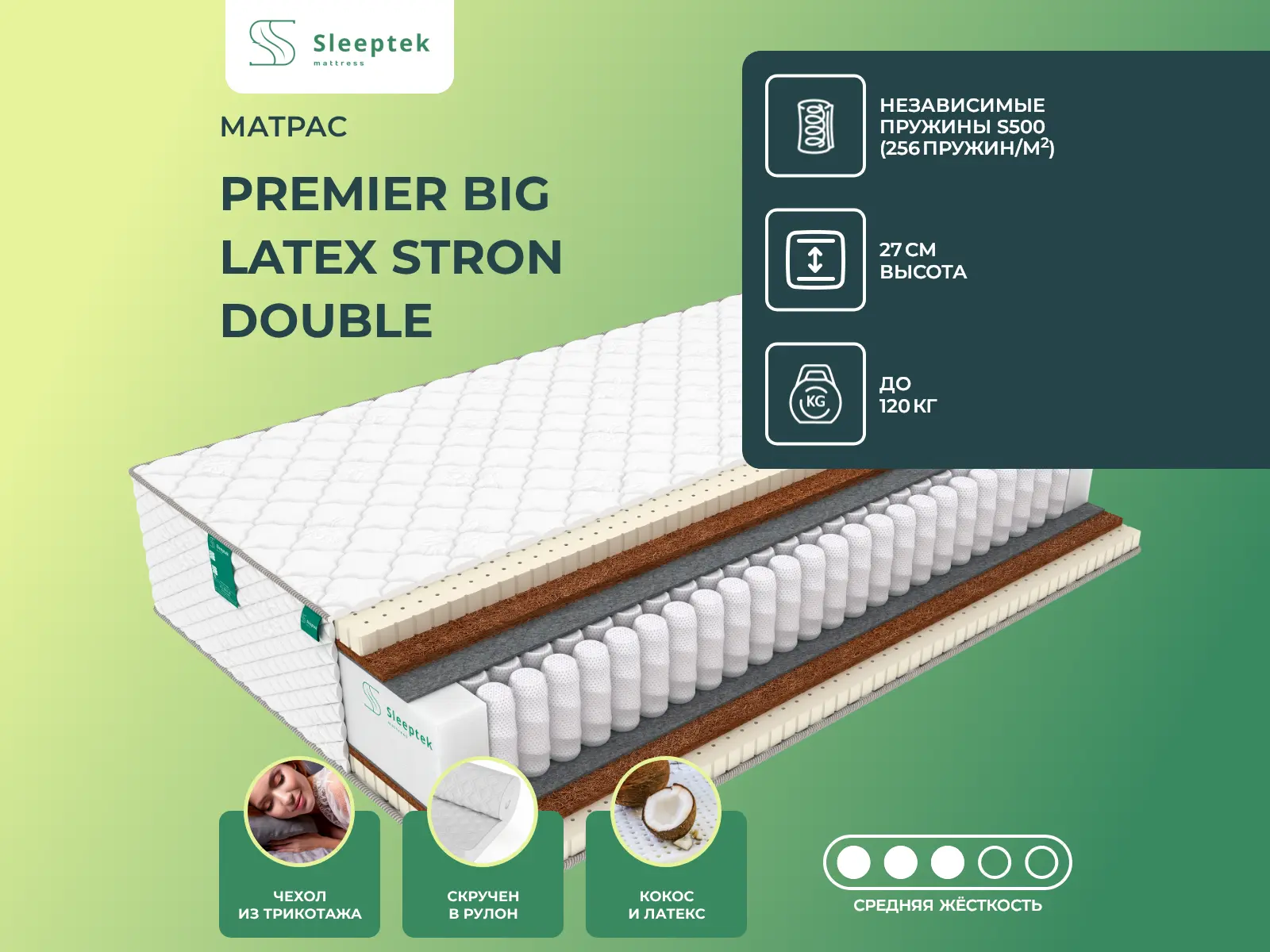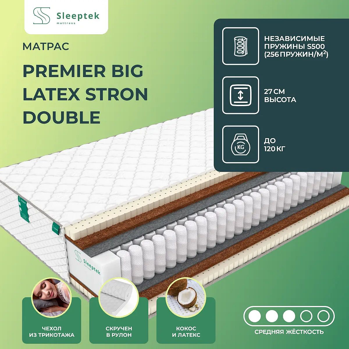 Матрас «Sleeptek Premier Big Latex Stron Double» — средней жесткости, которая подходит большинству людей среднего телосложения. Это — оптимальный выбор и детям, и взрослым, и пожилым людям.