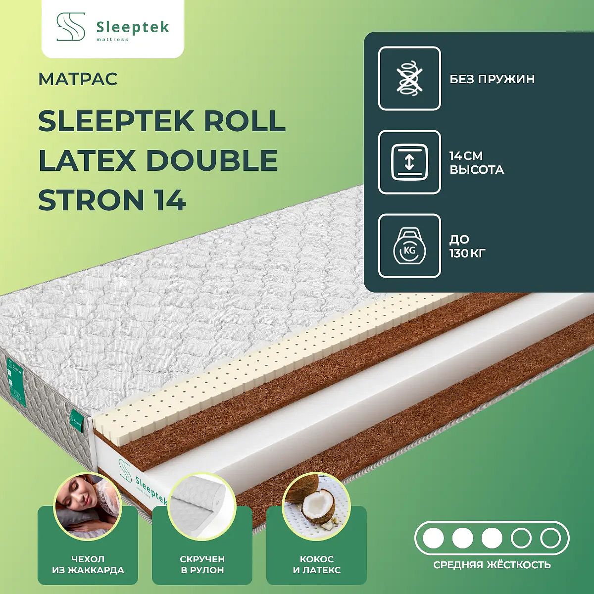 Матрас «Sleeptek Roll Latex Double Stron 14» — средней жесткости, которая подходит большинству людей среднего телосложения. Это — универсальный выбор и детям, и взрослым, и пожилым людям.