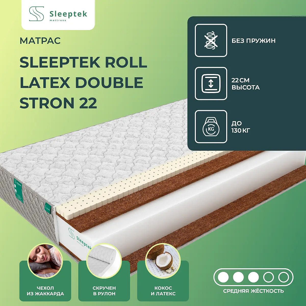 Матрас «Sleeptek Roll Latex Double Stron 22» — средней жесткости, которая комфортна большинству людей среднего телосложения. Это — оптимальный выбор и детям, и взрослым, и пожилым людям.