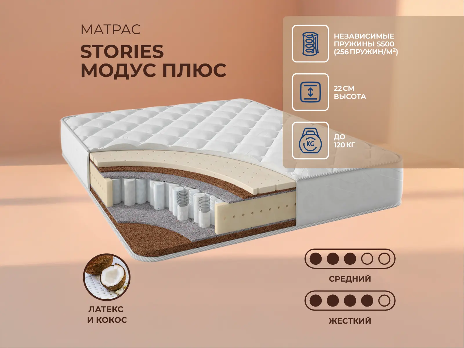 Кокос — натуральный материал, койра отлично дышит, придает матрасу «Модус Плюс» жесткость и упругость.