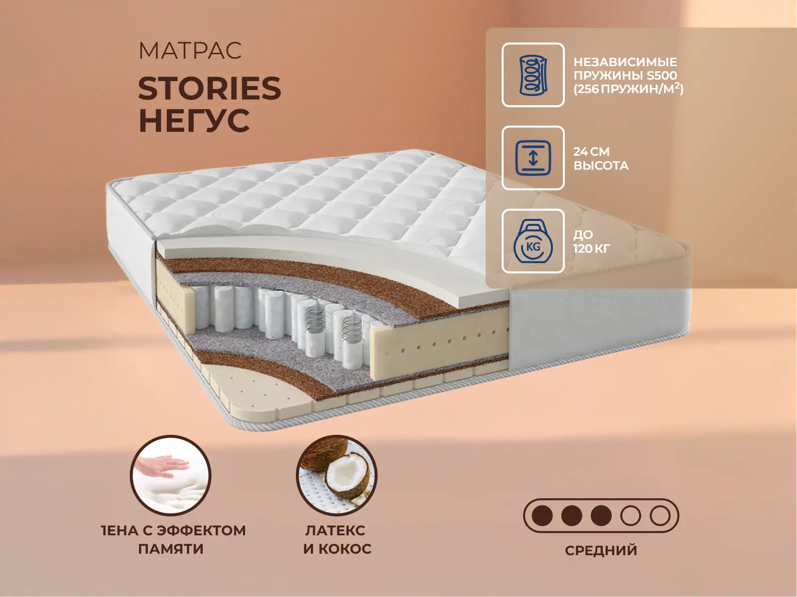 Матрас «Stories Негус» — средней жесткости, которая комфортна большинству людей среднего телосложения. Это — оптимальный выбор и детям, и взрослым, и пожилым людям.