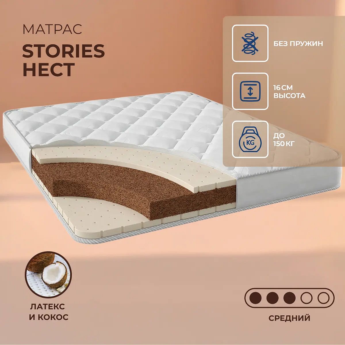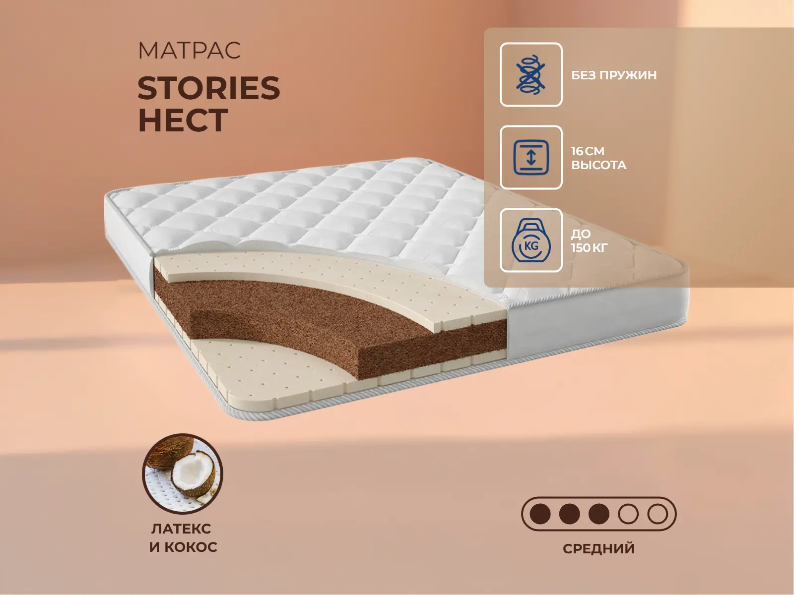 Матрас «Stories Нест» — средней жесткости, которая комфортна большинству людей среднего телосложения. Это — универсальный вариант и детям, и взрослым, и пожилым людям.