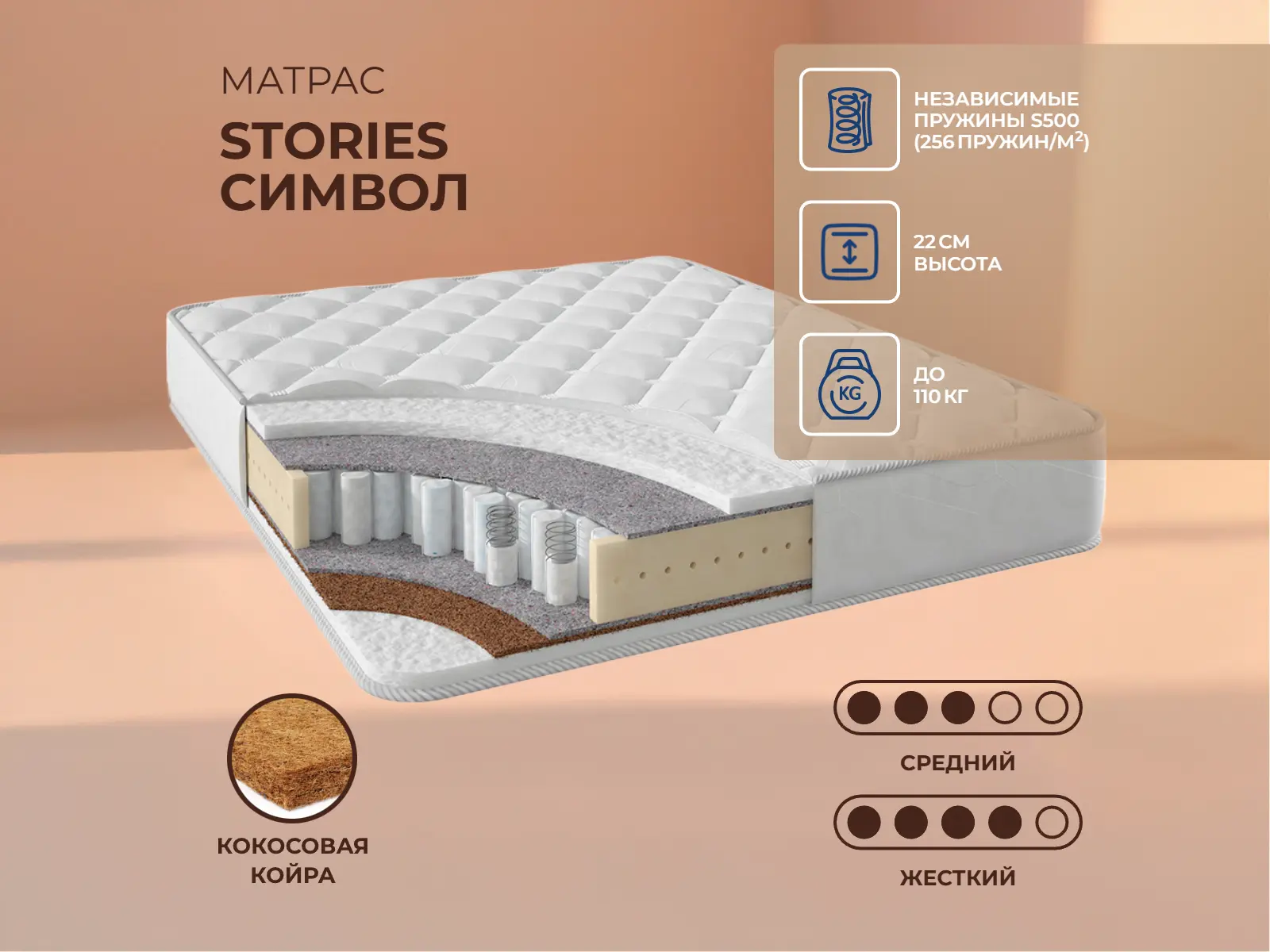 Кокос — натуральный материал, койра отлично дышит, придает матрасу «Символ» жесткость и упругость.