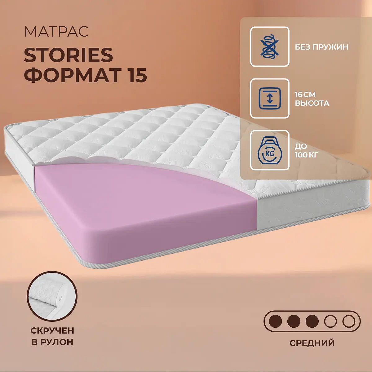 Матрас «Stories Формат 15» — средней жесткости, которая подходит большинству людей среднего телосложения. Это — оптимальный выбор и детям, и взрослым, и пожилым людям.