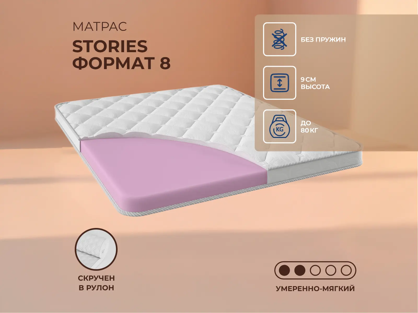 Средне-мягкий матрас «Stories Формат 8» — для настоящего ценителя комфорта. Такая модель отлично подойдет людям с небольшим весом.