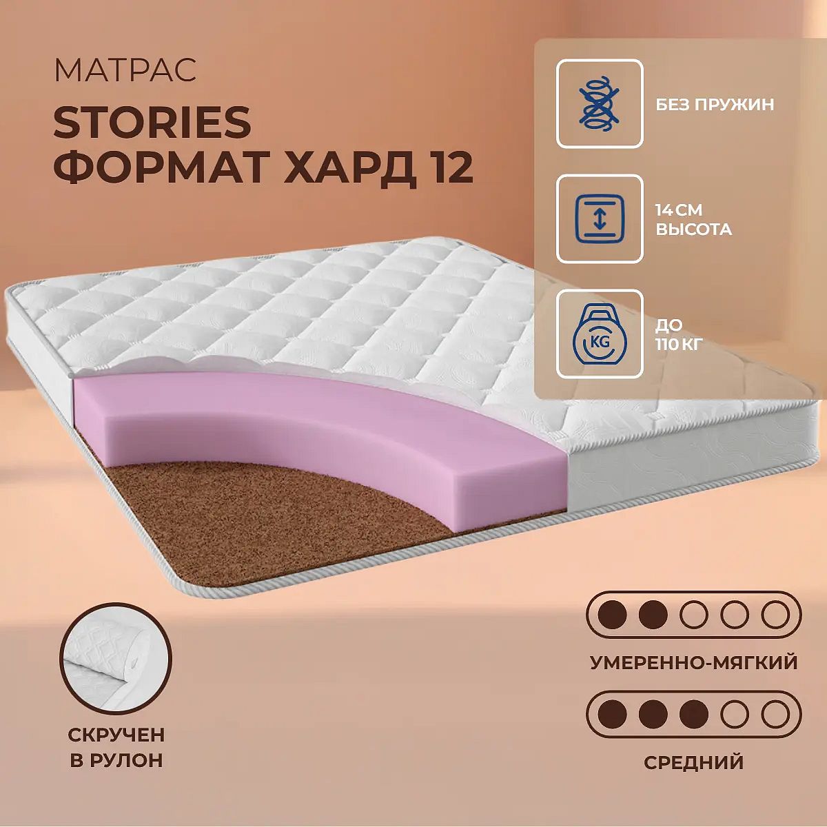 Матрас Stories Формат Хард 12 из коллекции Компакт — это качественный беспружинный матрас с разной степенью жесткости сторон для ежедневного комфортного сна. Благодаря сочетанию упругого пенополиуретана (ППУ) и слоя Poly Refine, матрас обеспечивает надежную поддержку и мягкость, подходящую для разных предпочтений: одна сторона — умеренно мягкая, вторая — средней жесткости. Высота матраса составляет 14 см, что делает его удобным для большинства современных кроватей. Матрас рассчитан на нагрузку до 110 кг на спальное место. Чехол выполнен из прочного жаккарда, простеганного на холконе плотностью 200 г, что делает поверхность приятной на ощупь и способствует долговечности изделия. Poly Refine — современный материал из спрессованных хлопковых и синтетических волокон, придающий конструкции дополнительную эластичность и износостойкость. Ключевые особенности