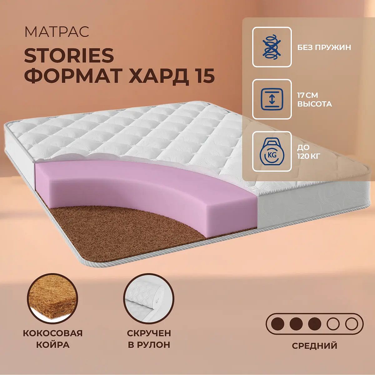 Матрас Stories Формат Хард 15 — это качественный беспружинный матрас средней и выше средней жесткости, созданный для комфортного сна и ежедневного использования. Благодаря сочетанию упругой пены (ППУ) и натуральной кокосовой койры, изделие поддерживает тело и помогает сохранять правильное положение позвоночника во время отдыха. Высота матраса составляет 17 см, что обеспечивает удобную посадку на кровати. Максимальная нагрузка на одно спальное место — до 120 кг. Чехол выполнен из прочного хлопкового жаккарда, простёганного на холконе (200 г), что делает поверхность приятной на ощупь и способствует воздухообмену. Матрас подходит для большинства стандартных кроватей, а по желанию может быть доставлен в скрученном виде для удобной транспортировки. Ключевые особенности