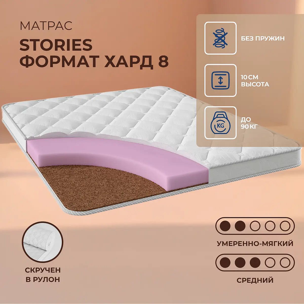 Матрас Stories Формат Хард 8 — это беспружинная модель с разной жесткостью сторон, позволяющая выбрать оптимальный комфорт для сна. Одна сторона умеренно мягкая, другая средней жесткости, что удобно для разных предпочтений и сценариев отдыха. Высота матраса — 10 см, он подходит для ежедневного использования и обеспечивает аккуратную посадку на кровати. В основе матраса — качественный слой ППУ (полиуретановой пены) толщиной 8 см, который равномерно распределяет нагрузку и поддерживает тело. Слой Poly Refine (1 см, плотность 1000 г/м2) придаёт дополнительную упругость и износостойкость, способствует свободному воздухообмену. Такой состав делает матрас долговечным и приятным в эксплуатации. Ключевые особенности