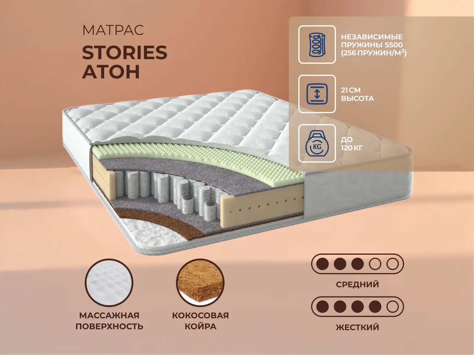 Кокос — натуральный материал, койра отлично дышит, придает матрасу «Атон» жесткость и упругость.
