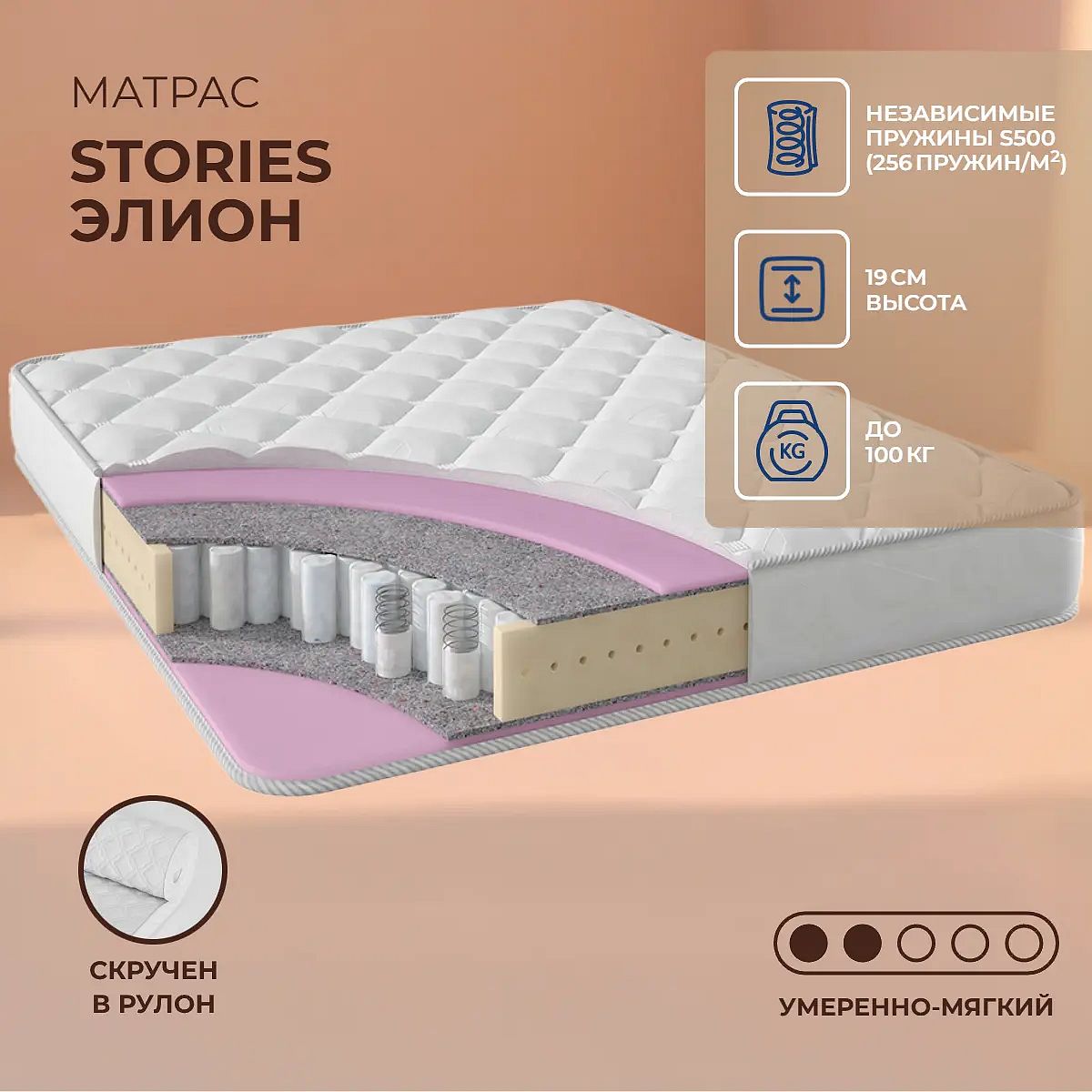 Средне-мягкий матрас «Stories Элион» просто создан для истинного ценителя комфорта. Такая модель хорошо подойдет людям с небольшим весом.