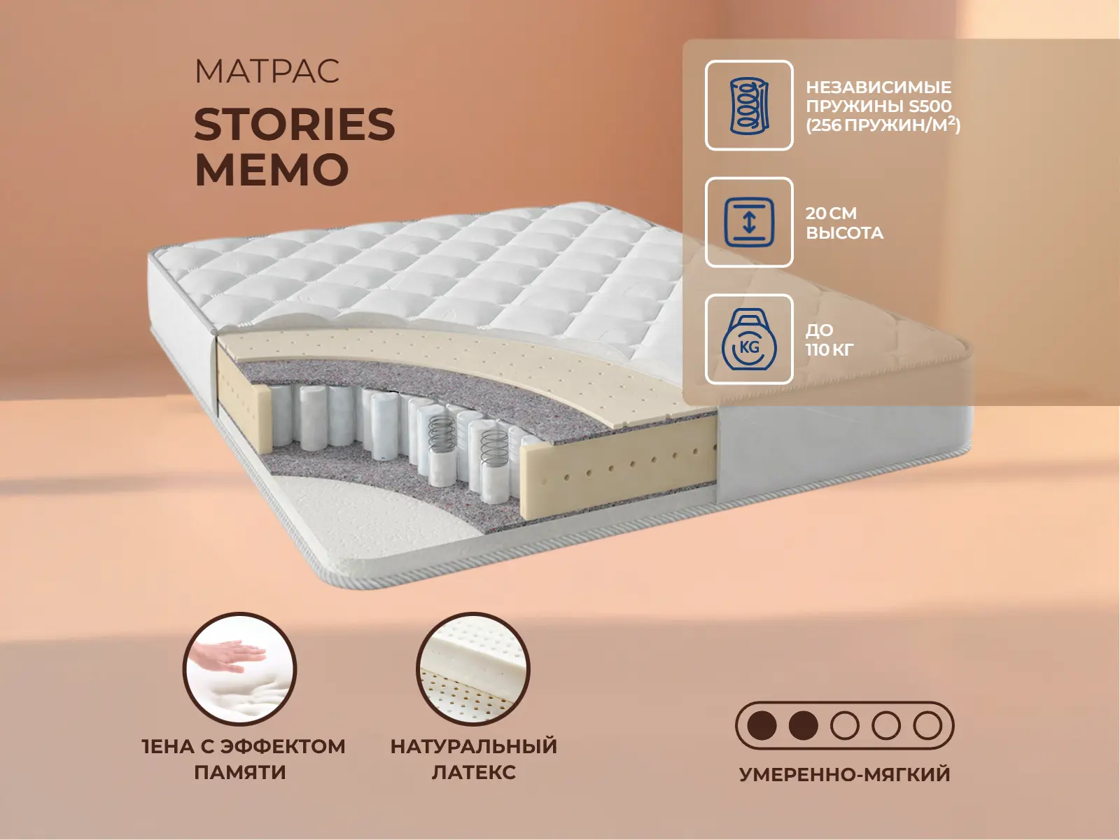 Средне-мягкий матрас «Stories Мемо» просто создан для истинного ценителя комфорта. Такой вариант хорошо подходит людям с небольшим весом.