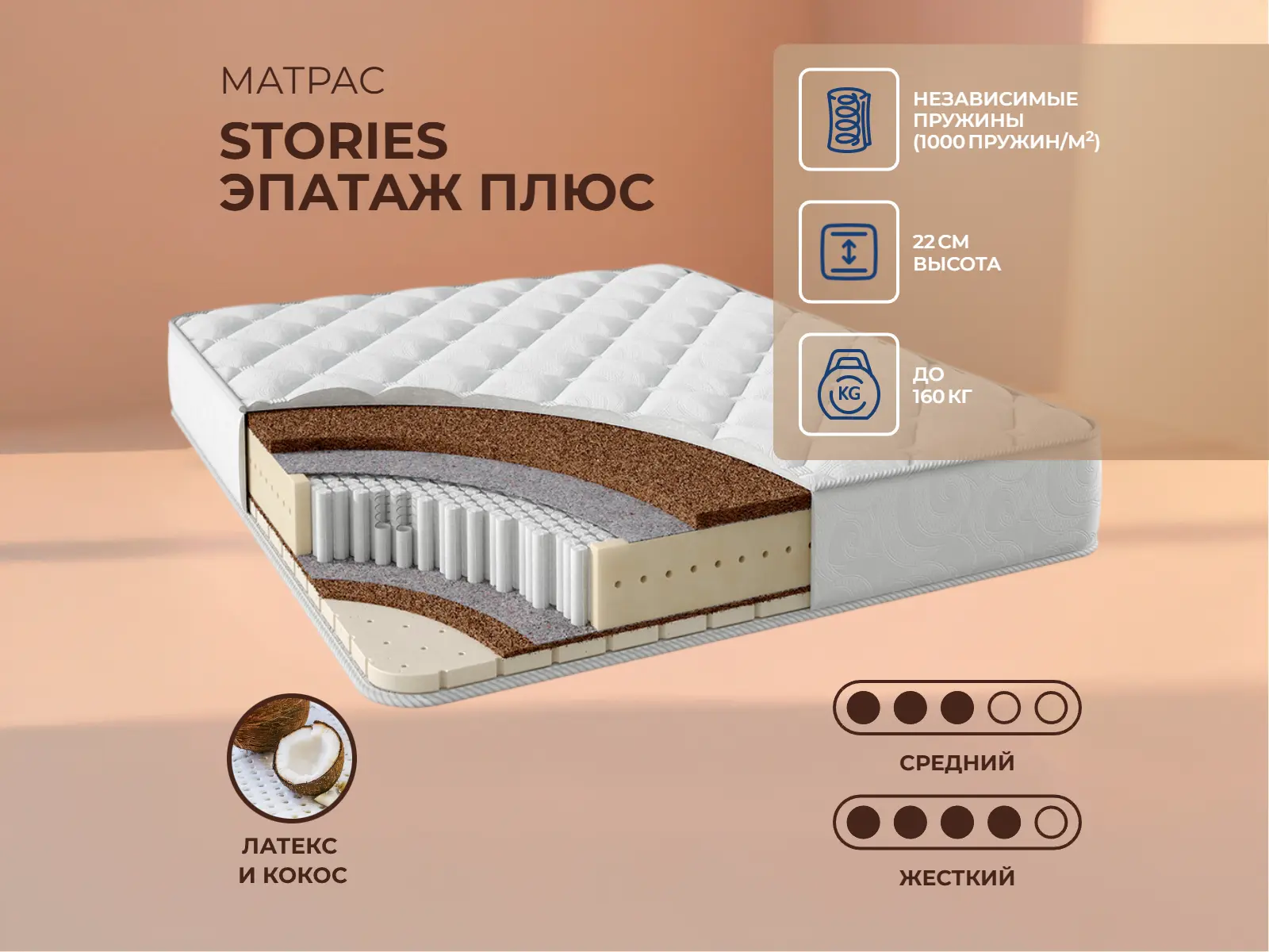 Кокос — натуральный материал, койра отлично дышит, придает матрасу «Эпатаж Плюс» жесткость и упругость.