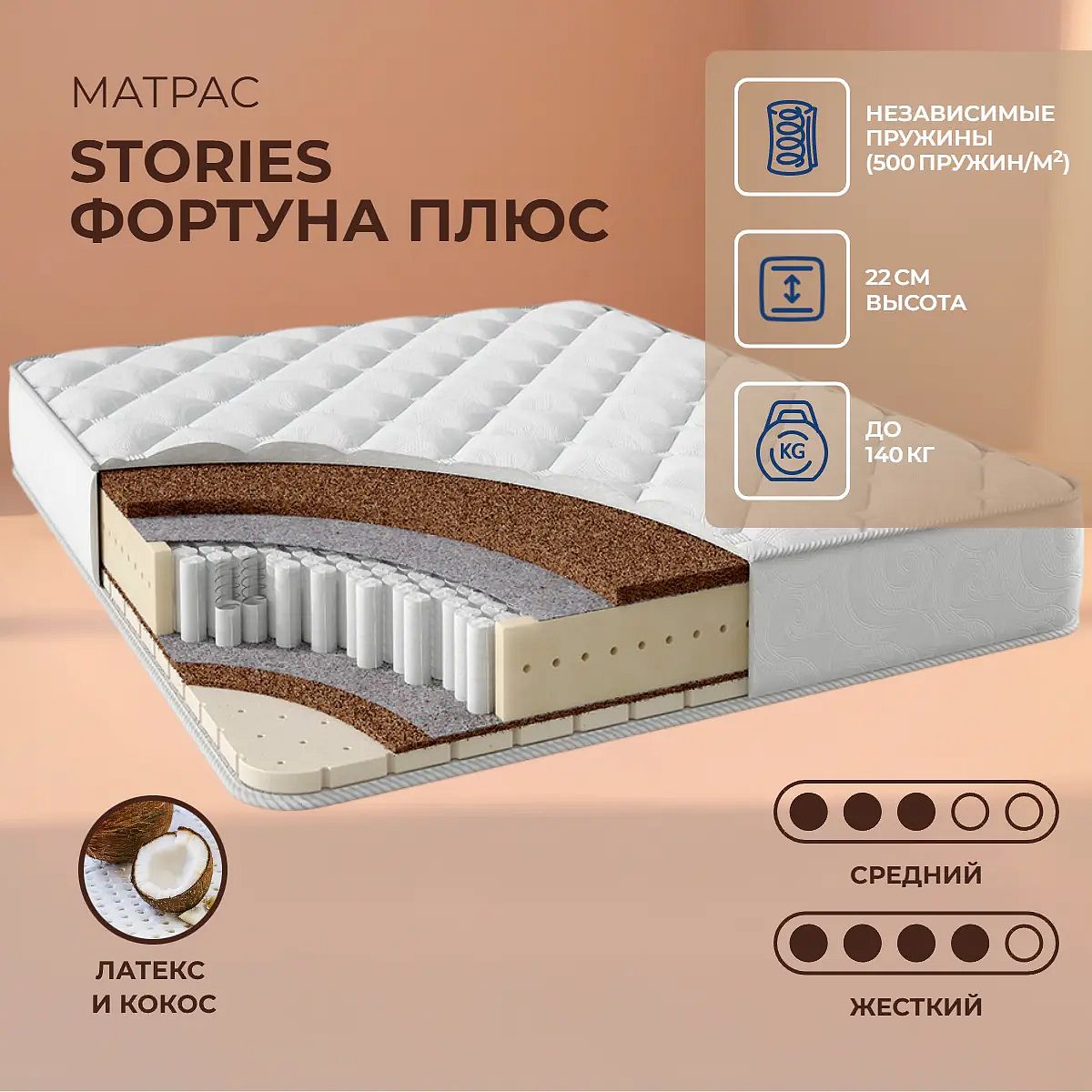Кокос — натуральный материал, койра отлично дышит, придает матрасу «Фортуна Плюс» жесткость и упругость.