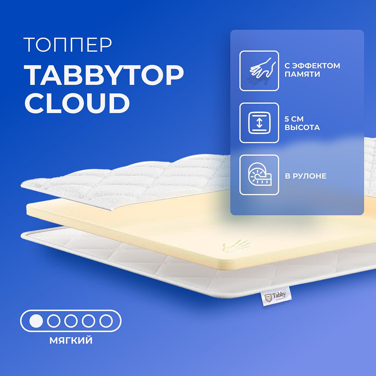 Топпер TabbyTop Cloud — мягкий беспружинный матрас высотой 5 см, созданный для повышения комфорта сна. Его основа — слой материала Мемориформ толщиной 4 см, который подстраивается под контуры тела и обеспечивает приятную мягкость. Такой топпер отлично подходит для смягчения жёсткой поверхности матраса или дивана, а также для обновления спального места без замены основного матраса. Съёмный чехол выполнен из прочного жаккарда со стёжкой из ППУ высотой 0,8 см. Чехол приятен на ощупь, хорошо пропускает воздух и устойчив к ежедневному использованию. По углам предусмотрены надёжные резинки для фиксации на матрасе, что предотвращает сдвиги во время сна. Ключевые особенности