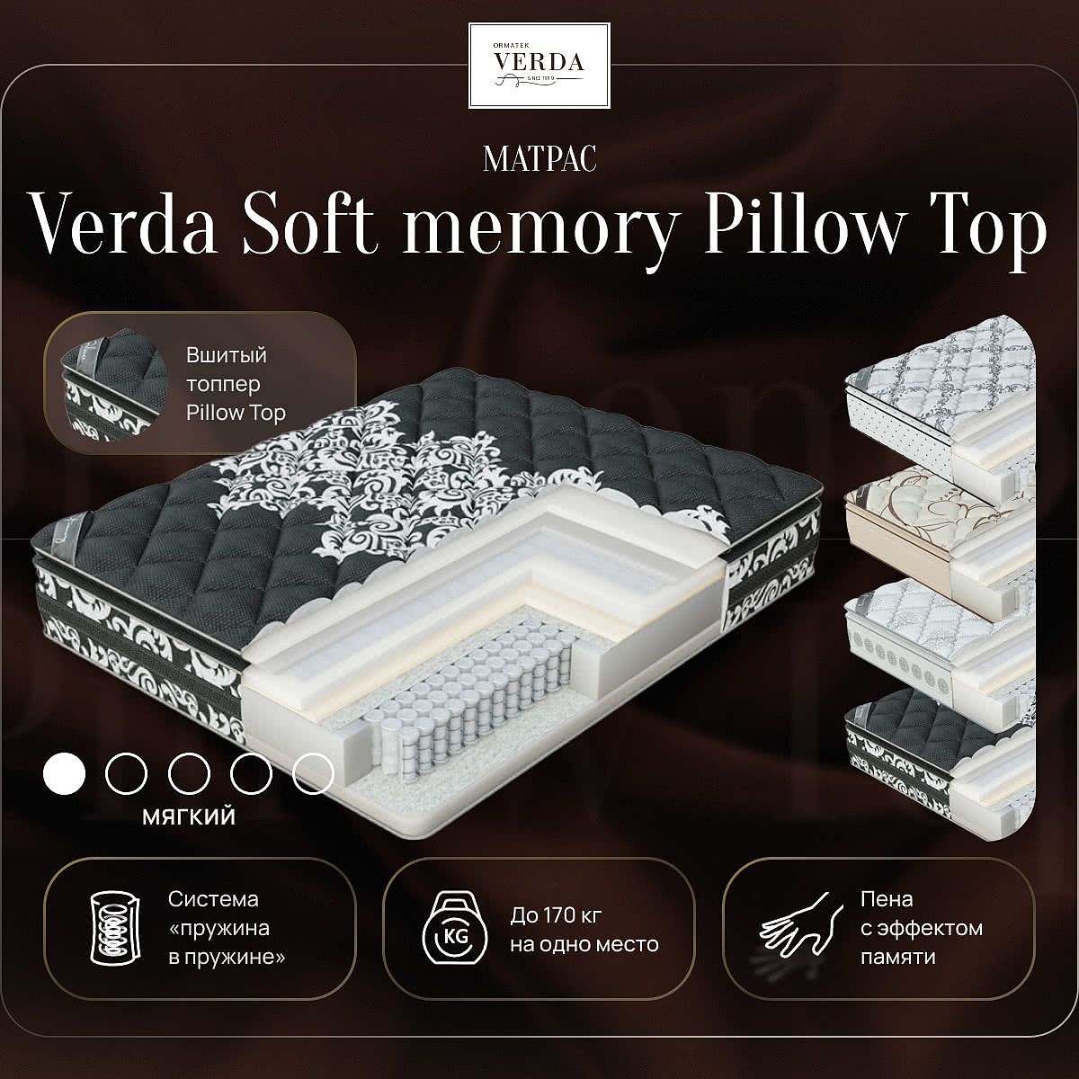 Допустимая разница в весе, кг: 80. Жесткость: низкая. Высота, см: 35. Все модели матрасов Verda доступны в 4-х цветовых вариантах чехла, каждый из которых отличается уникальным рисунком. Чехлы матрасов Verda имеют максимальное двойное наполнение гипоаллергенным материалом Micro 400, отличающимся особой стойкостью к многочисленным деформациям. Микроволокно этого наполнителя в 2 раза тоньше, чем у обычных полиэфирных наполнителей.