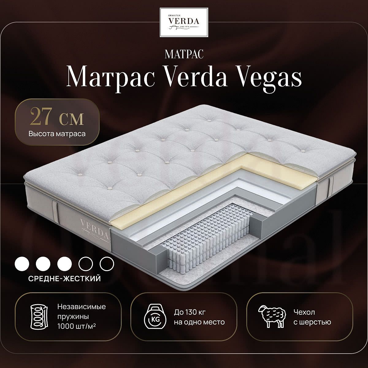 Матрас Verda Vegas – премиальный матрас средней жесткости. Идеально подобранная комбинация поддержки для позвоночника с эффектом сна на пуховой перине.Это односторонний матрас премиум класса, выполненный с использованием технологии тафтинга. Средняя жесткость матраса достигается за счет комбинации слоев латексного поролона, обладающего высокой эластичностью, адаптивной пены High-resilience foam, которая повышает свойства матраса для наилучшей подстройки под индивидуальные особенности тела человека и плотной пены, быстро восстанавливающей форму. Состав матраса: